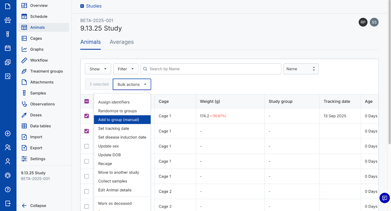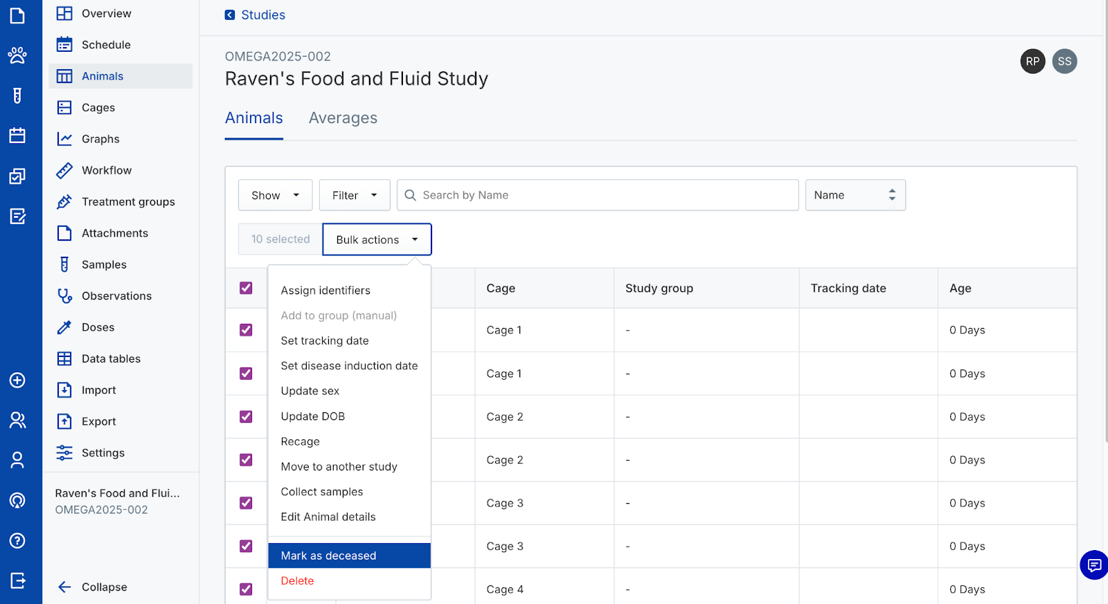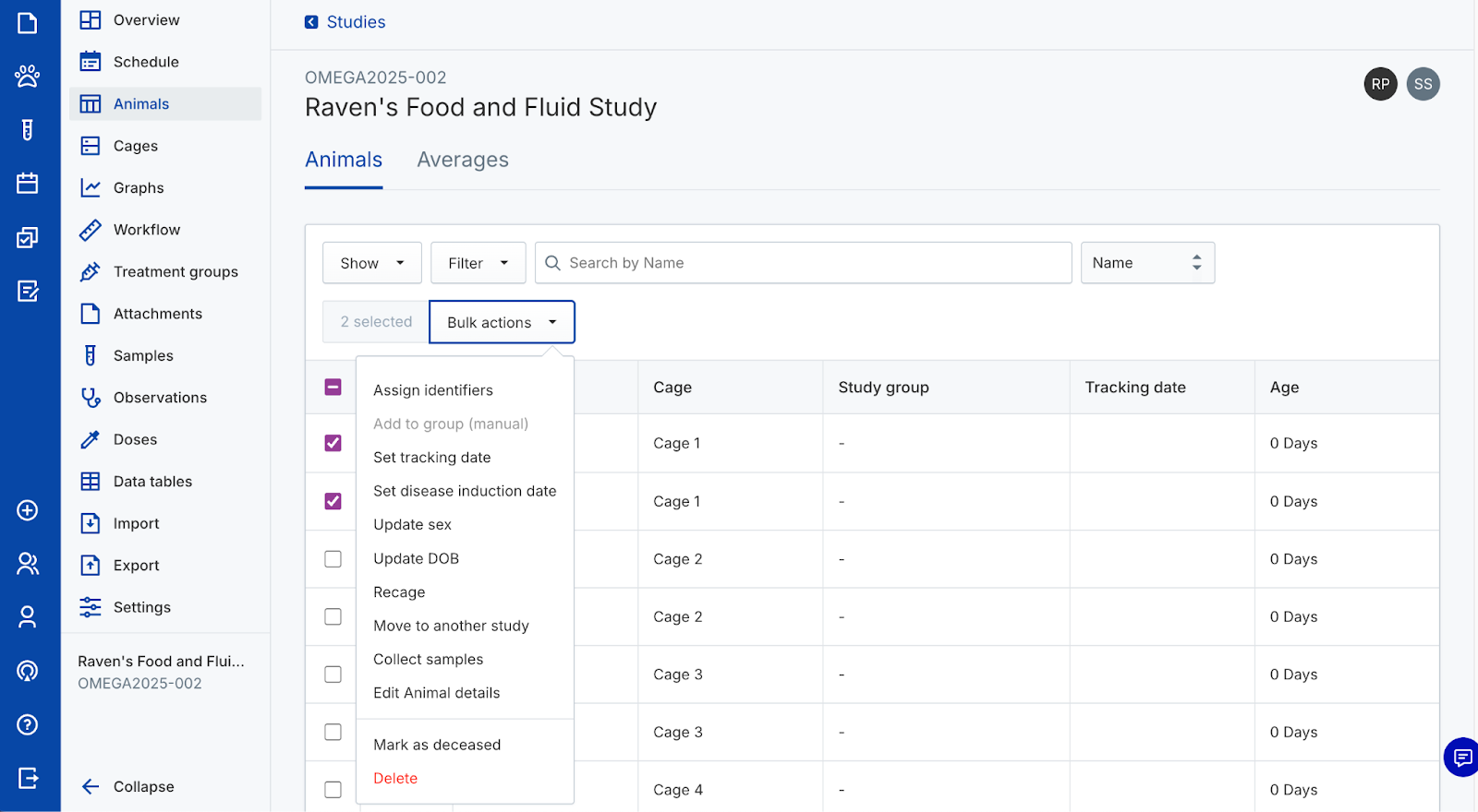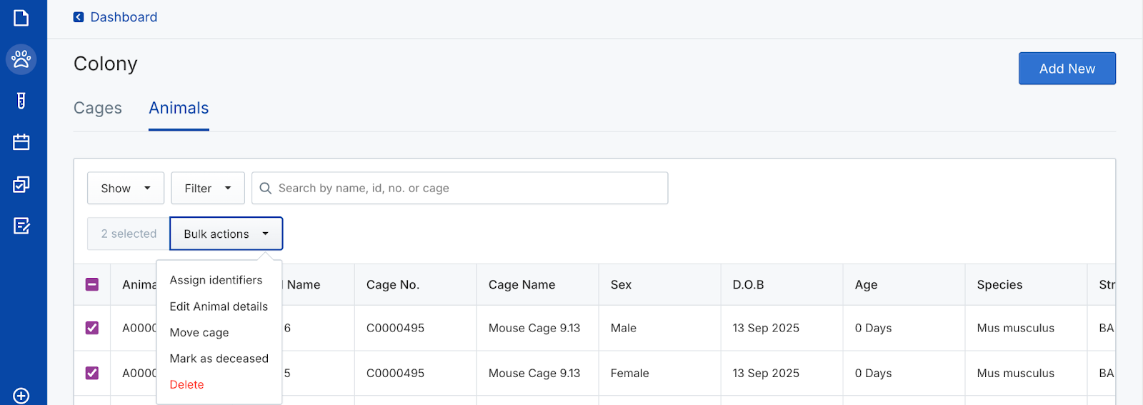 Use animal objects to capture In Vivo study data. Create new cages and animals, assign identifiers, randomize animals into groups, and track their data over time. Perform actions on individual animals or manage them in bulk from the colony or a study.
