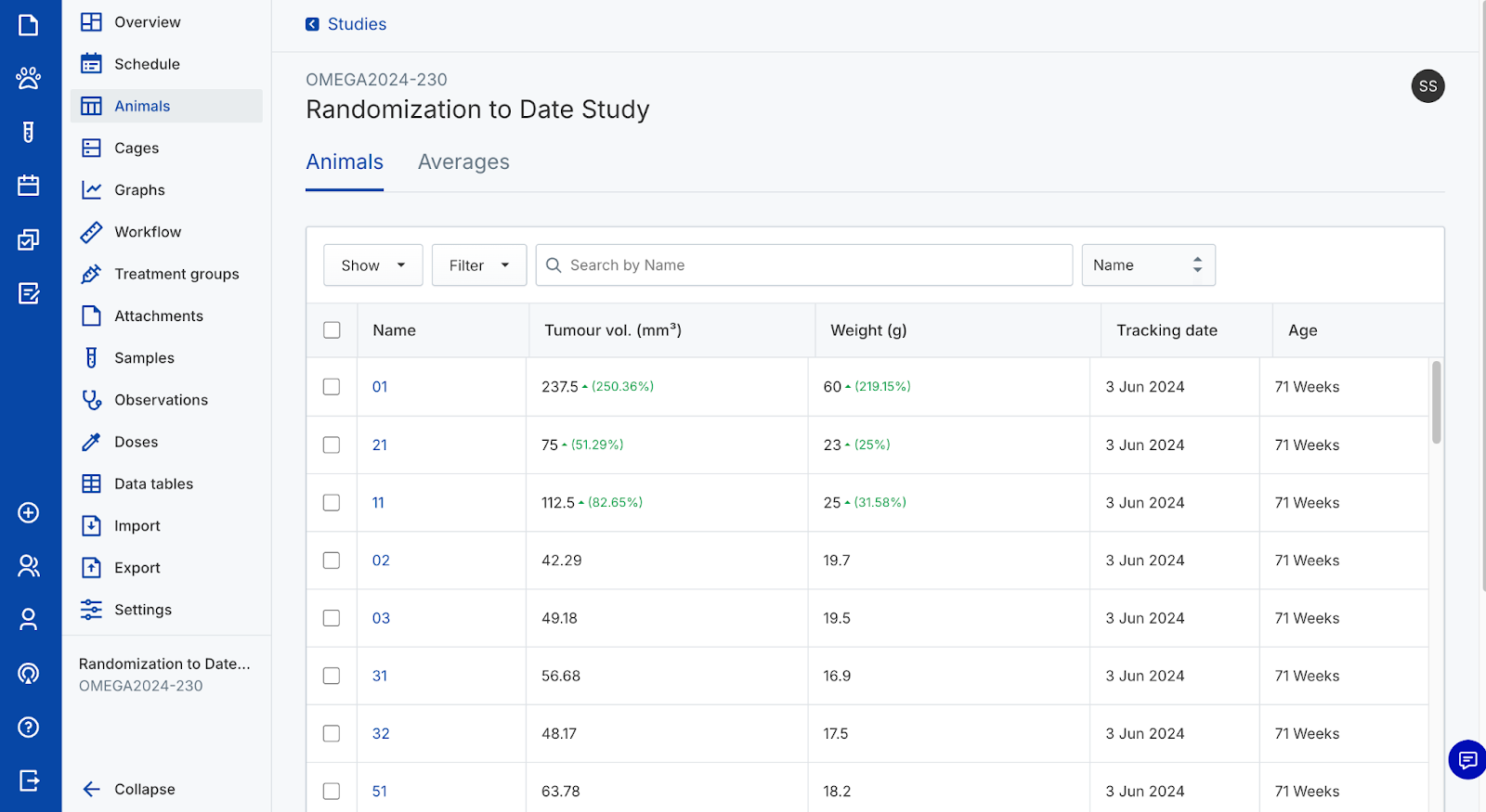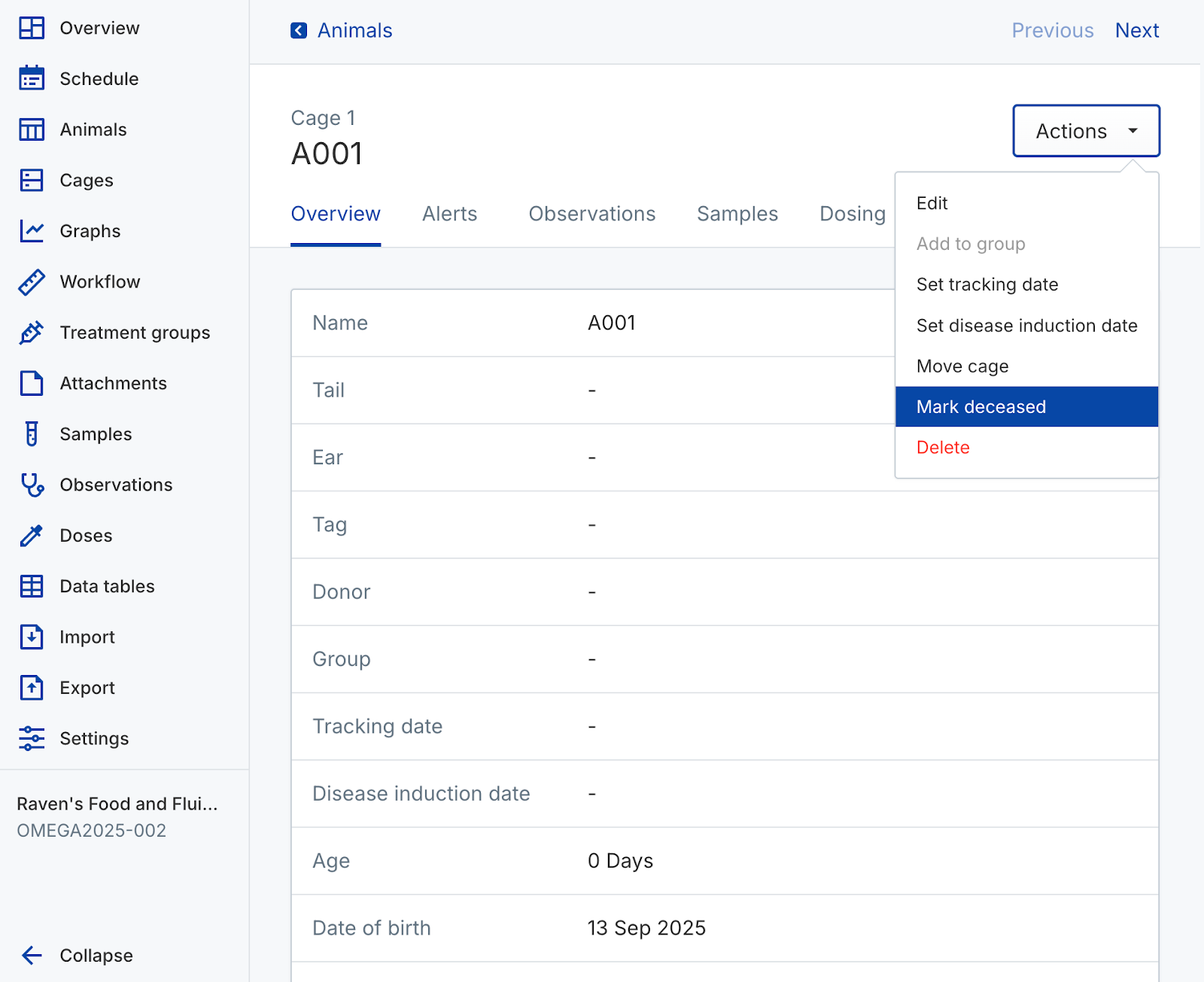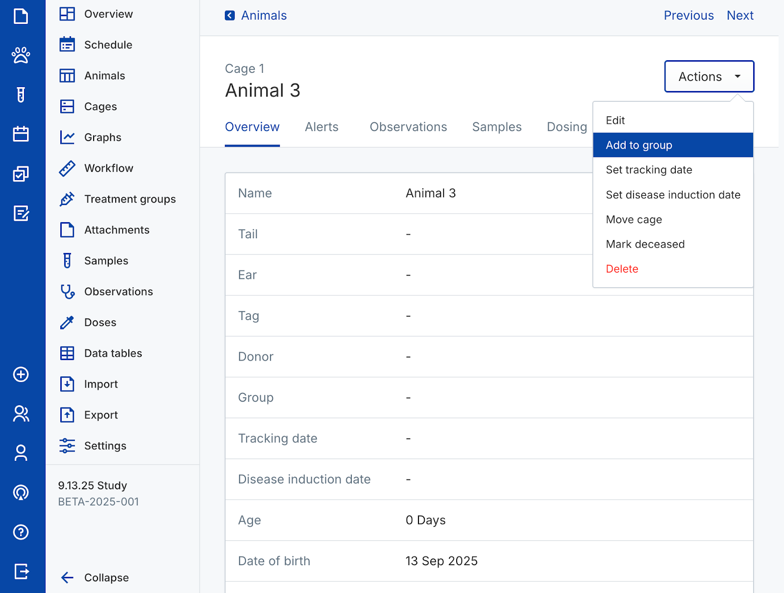 Use animal objects to capture In Vivo study data. Create new cages and animals, assign identifiers, randomize animals into groups, and track their data over time. Perform actions on individual animals or manage them in bulk from the colony or a study.