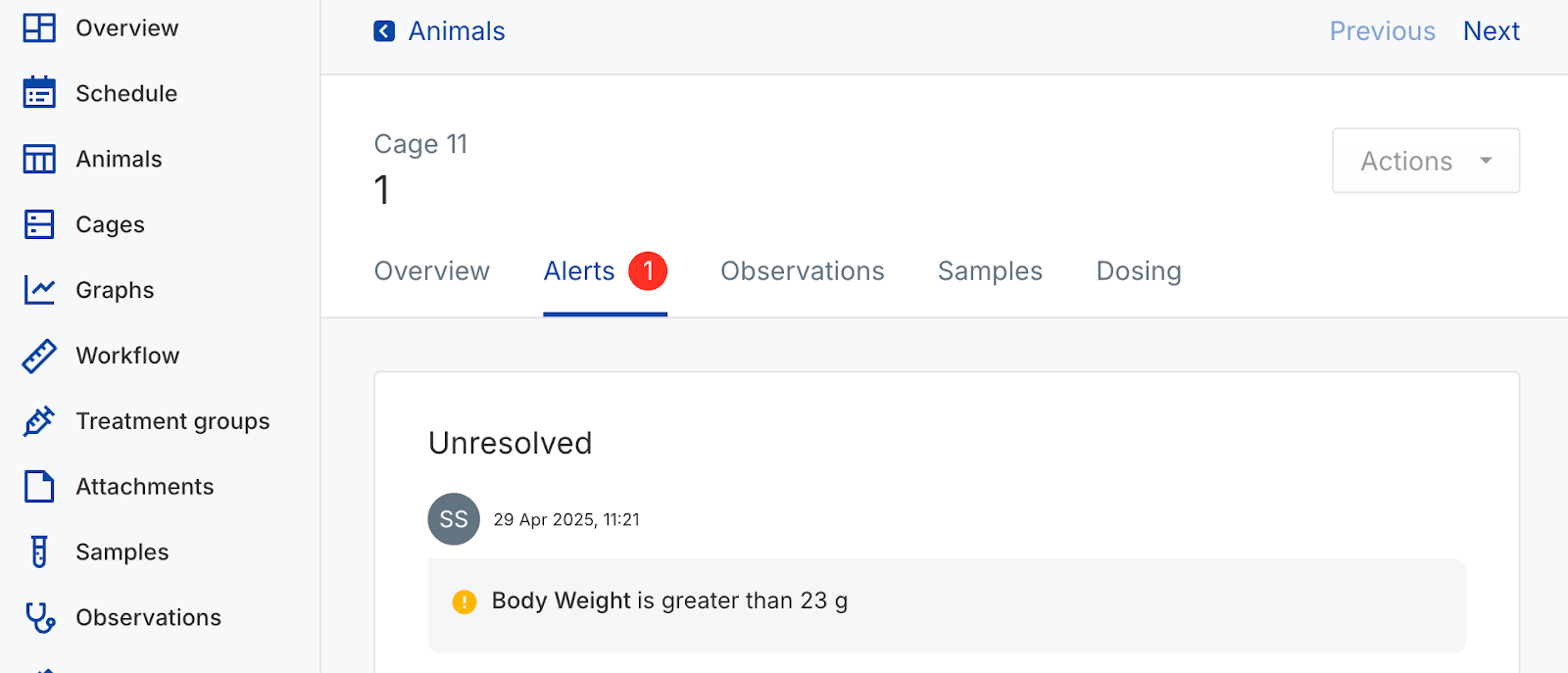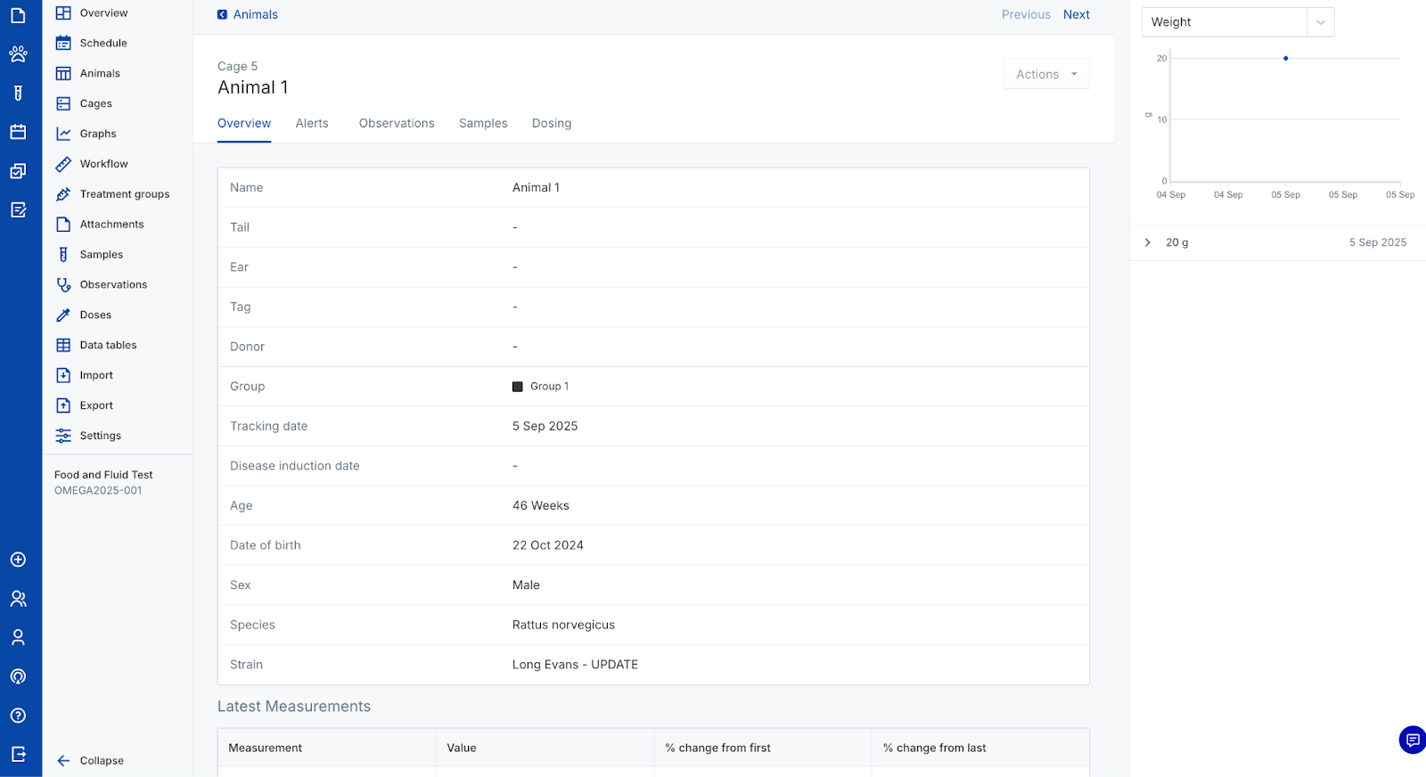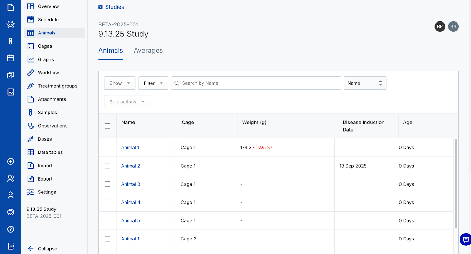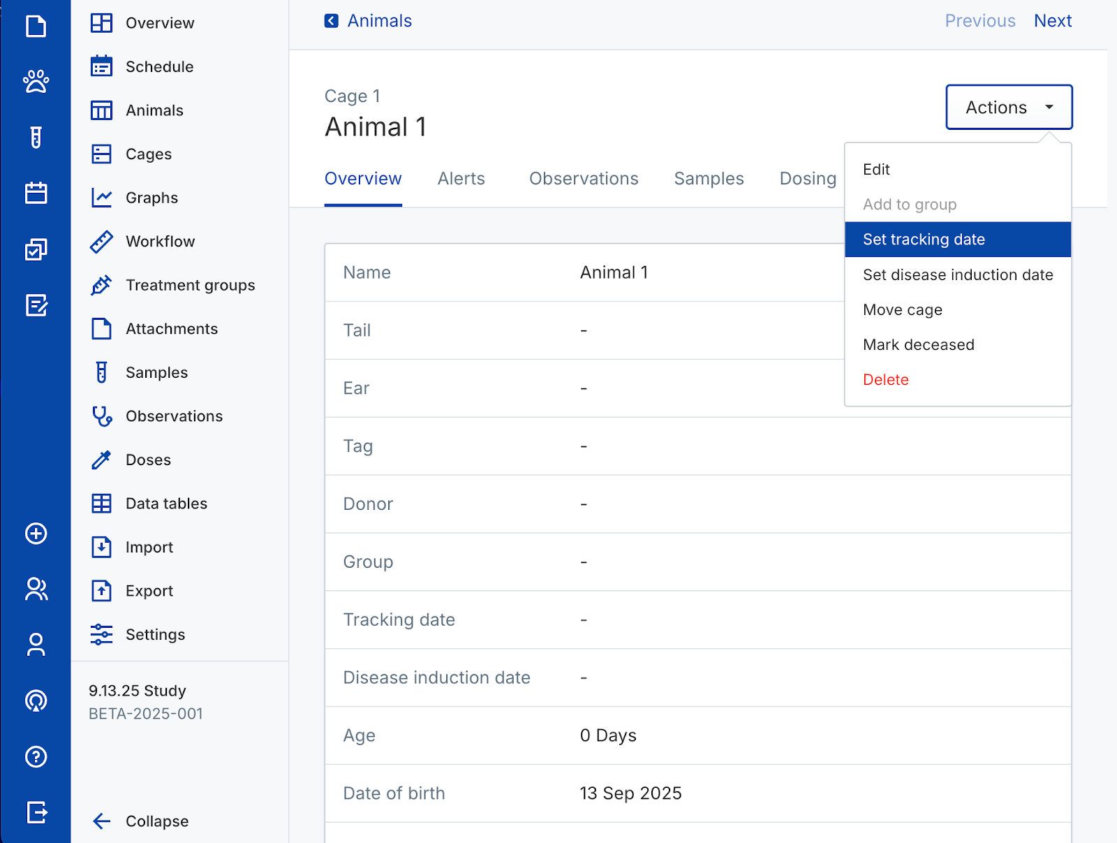 Use animal objects to capture In Vivo study data. Create new cages and animals, assign identifiers, randomize animals into groups, and track their data over time. Perform actions on individual animals or manage them in bulk from the colony or a study.