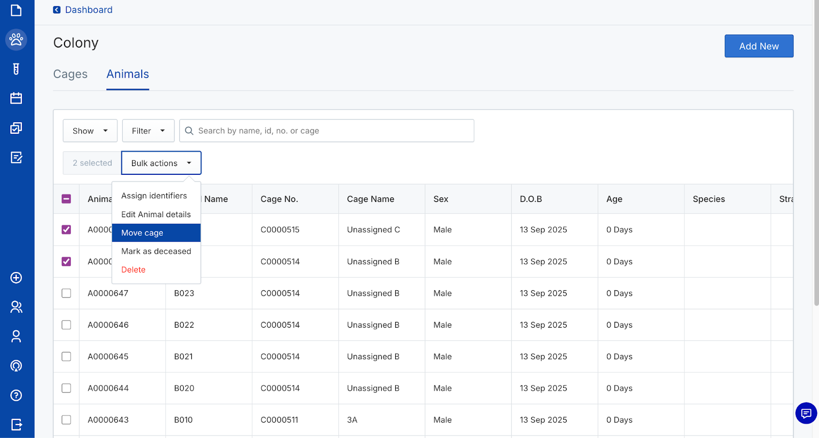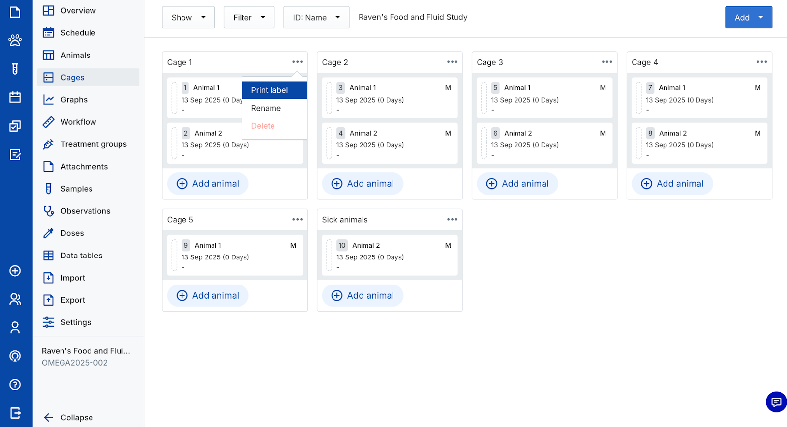 - Click Add to create new cages and/or animals