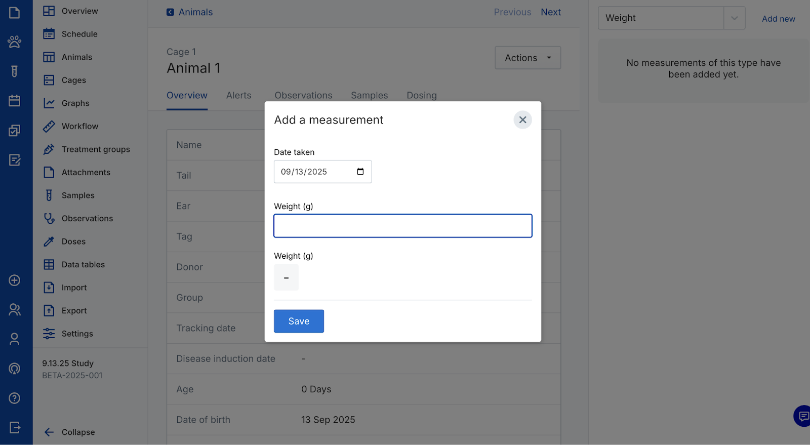 - To add an animal, click Add animal to add a new animal to the cage