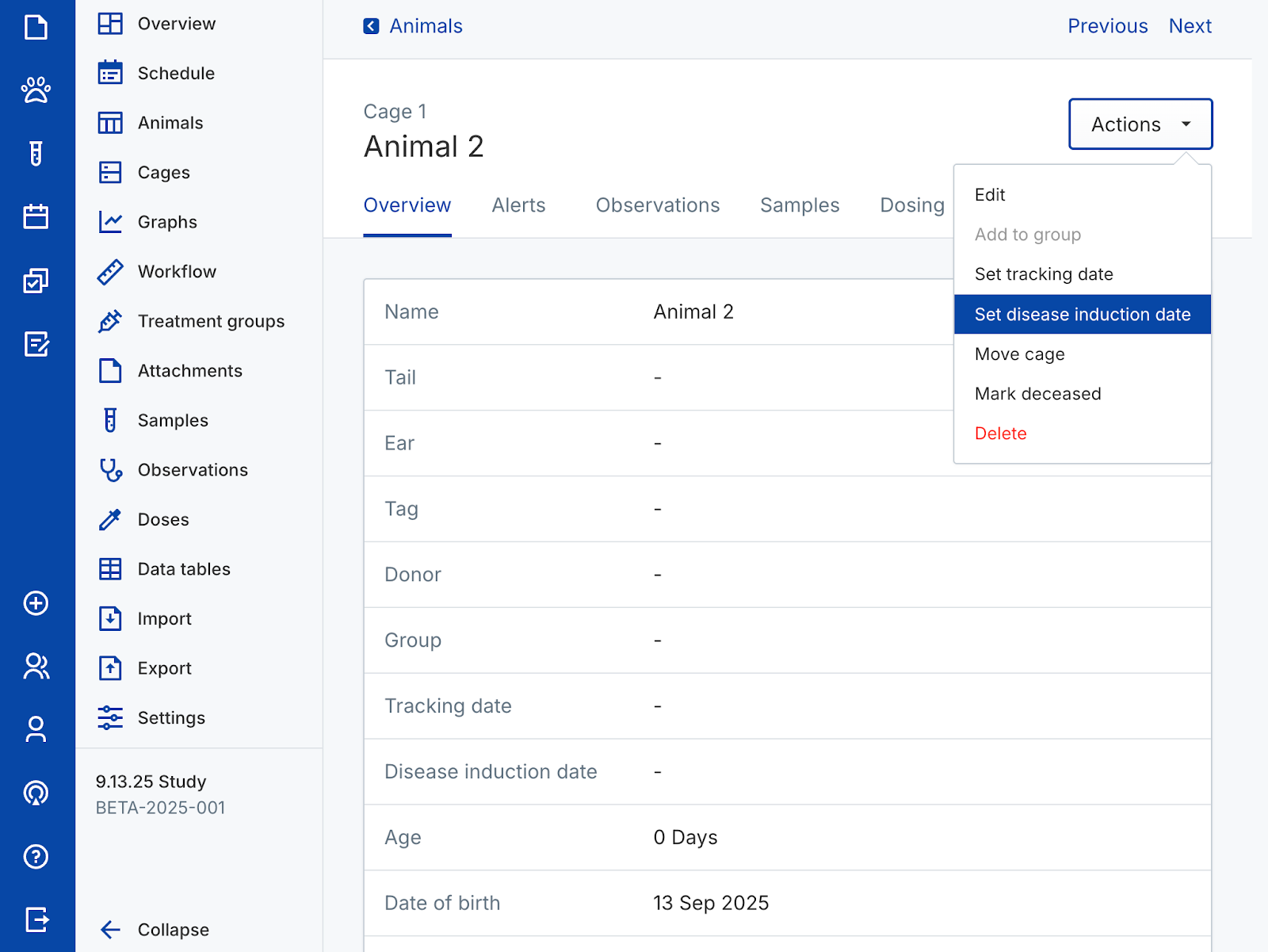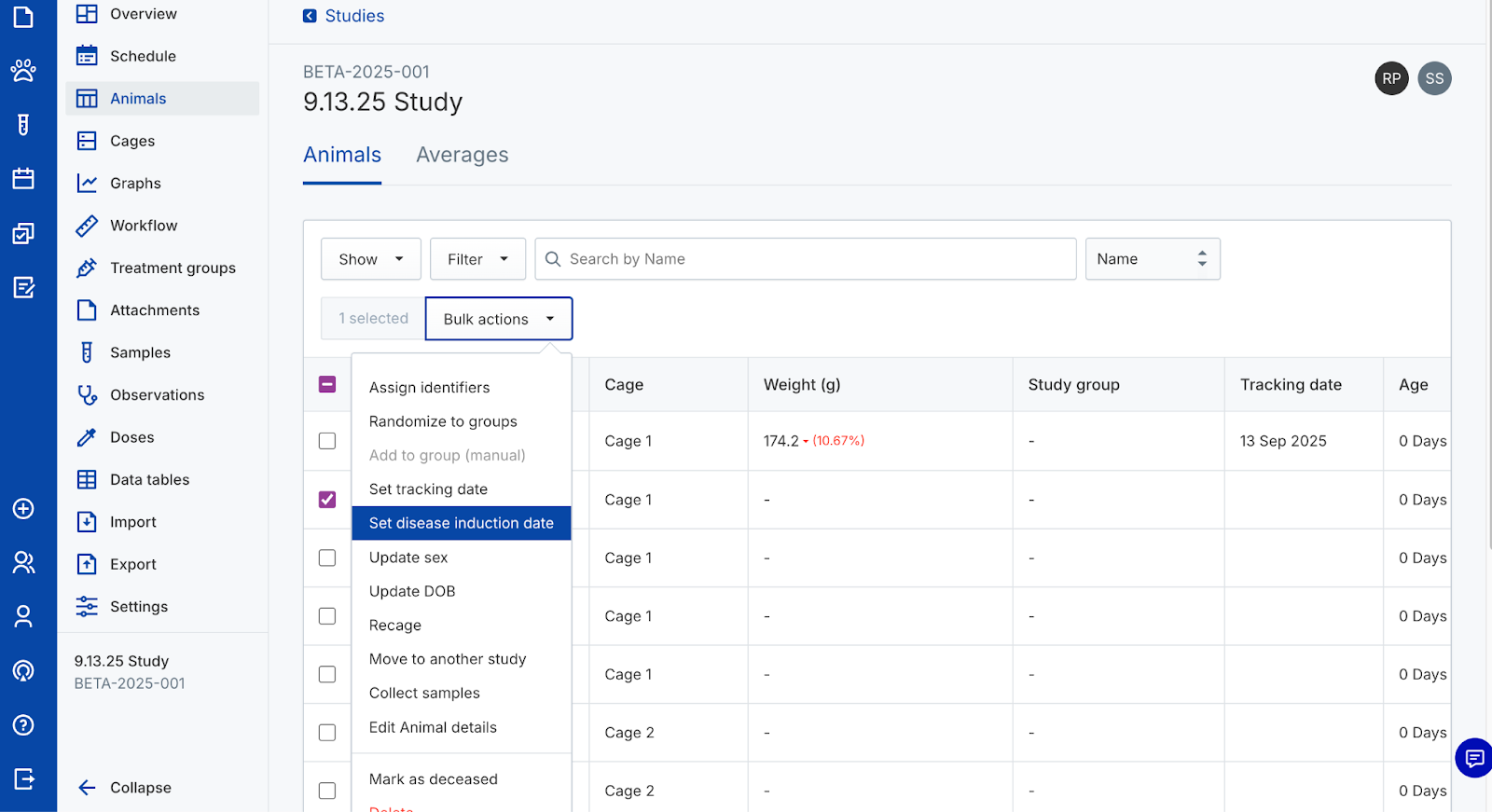 - Set disease induction date to assign the animal a disease induction date