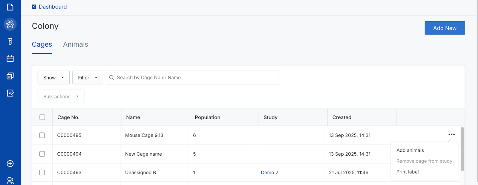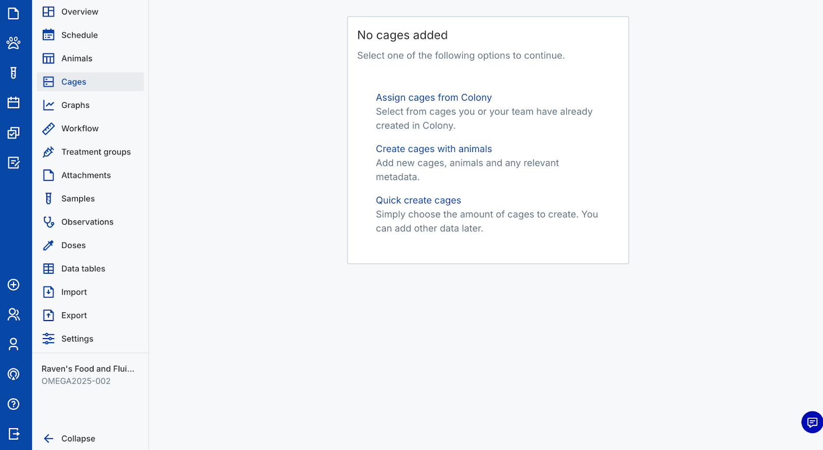 - Assign cages from Colony to assign existing cages to the study from the Colony