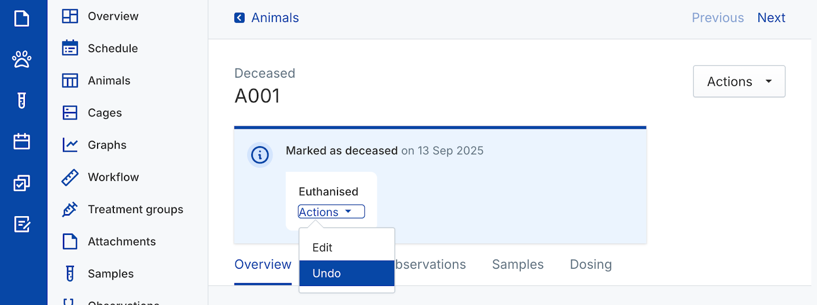 Mark as deceased to mark an animal as deceased.