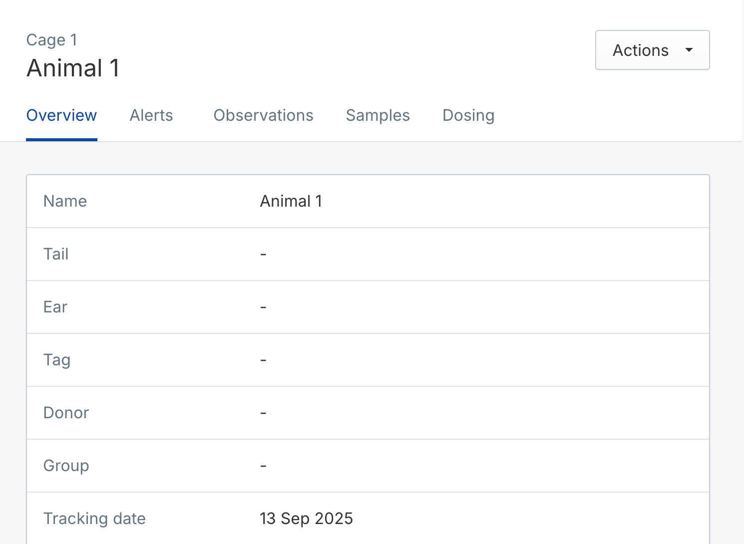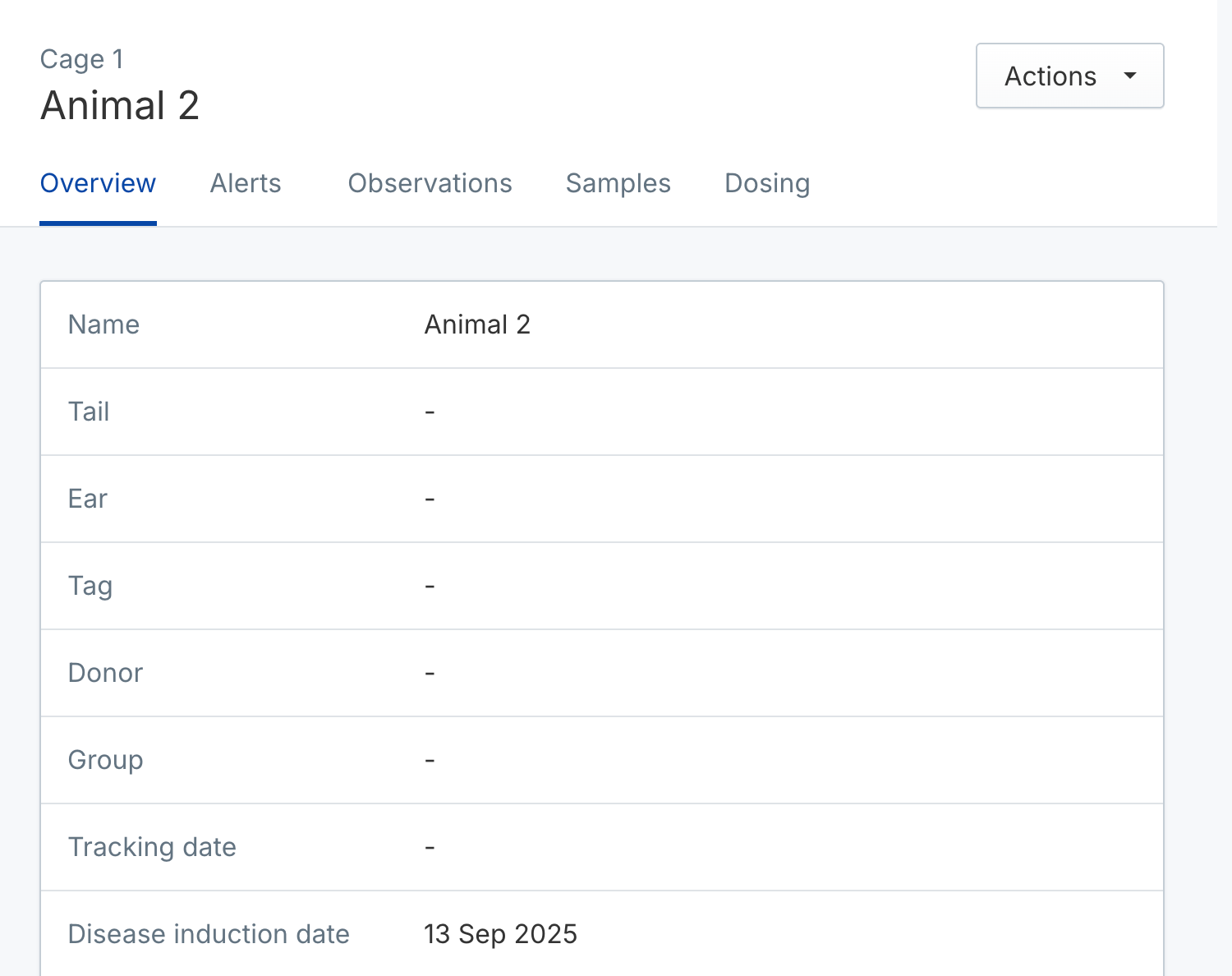 - Cage number: Cages are named using an autoincrementing number per study (e.g. Cage 1, Cage 2, Cage 3)