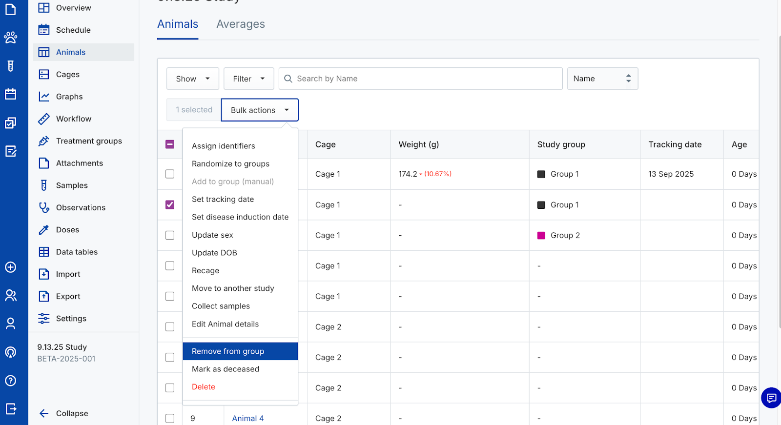 - To recage animals based on group assignment, see the Recaging animals and follow the Via Recage within a Study instructions.