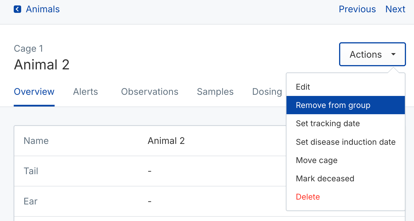 - Remove from group to remove the animal from its assigned group