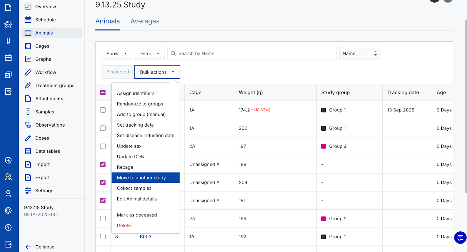 Manage animals in a study
