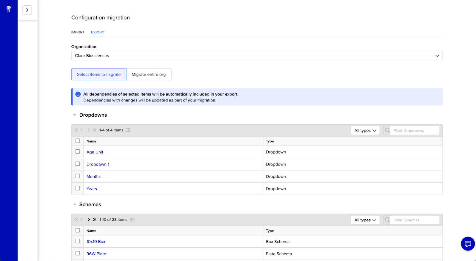 - Use the Organization dropdown to choose the organization that contains the configurations you want to migrate. Once selected, tables with the configurations from that organization will be displayed, grouped by object type: Dropdowns, Schemas, Templates, and Workflows