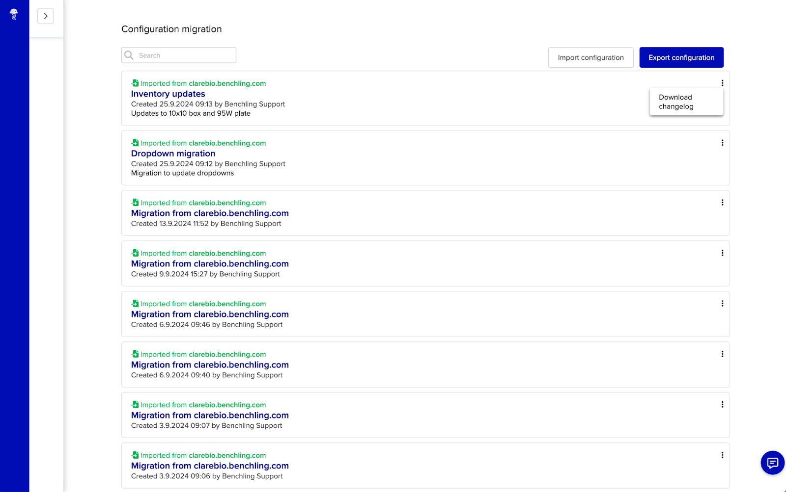 - If you’d like to view the new migration import navigate back to the main configuration migration page where you will see a new entry has been added. You can Re-download the changelog for a previous migration as needed