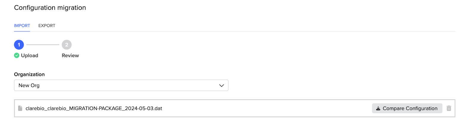 This diff report can be downloaded at the beginning of the import process. After uploading your migration file and selecting an organization, you will see the option to Compare configuration. Clicking this downloads a file detailing the differences between the configuration in your import file and the configuration in the selected destination organization.