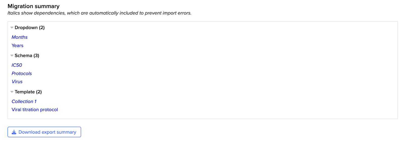 - Click Download export summary below the Migration Summary to save a human-readable list of all the items to be migrated