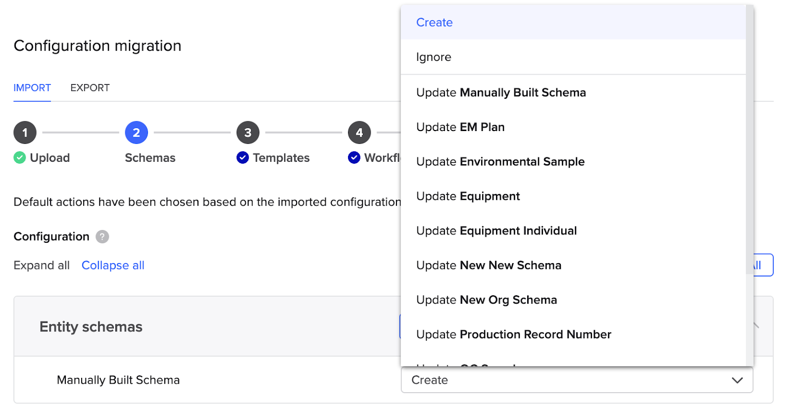 For example, if you are migrating a "Manually Built Schema" for the first time, it will default to Create. However, if you know there is a matching schema on the destination tenant, you should click into the Actions dropdown and search for it. The tool will list exact name matches at the top. You would then select the matching schema and can expand the view to ensure the fields match as expected. Alternatively, you could still choose Create from the Actions dropdown.