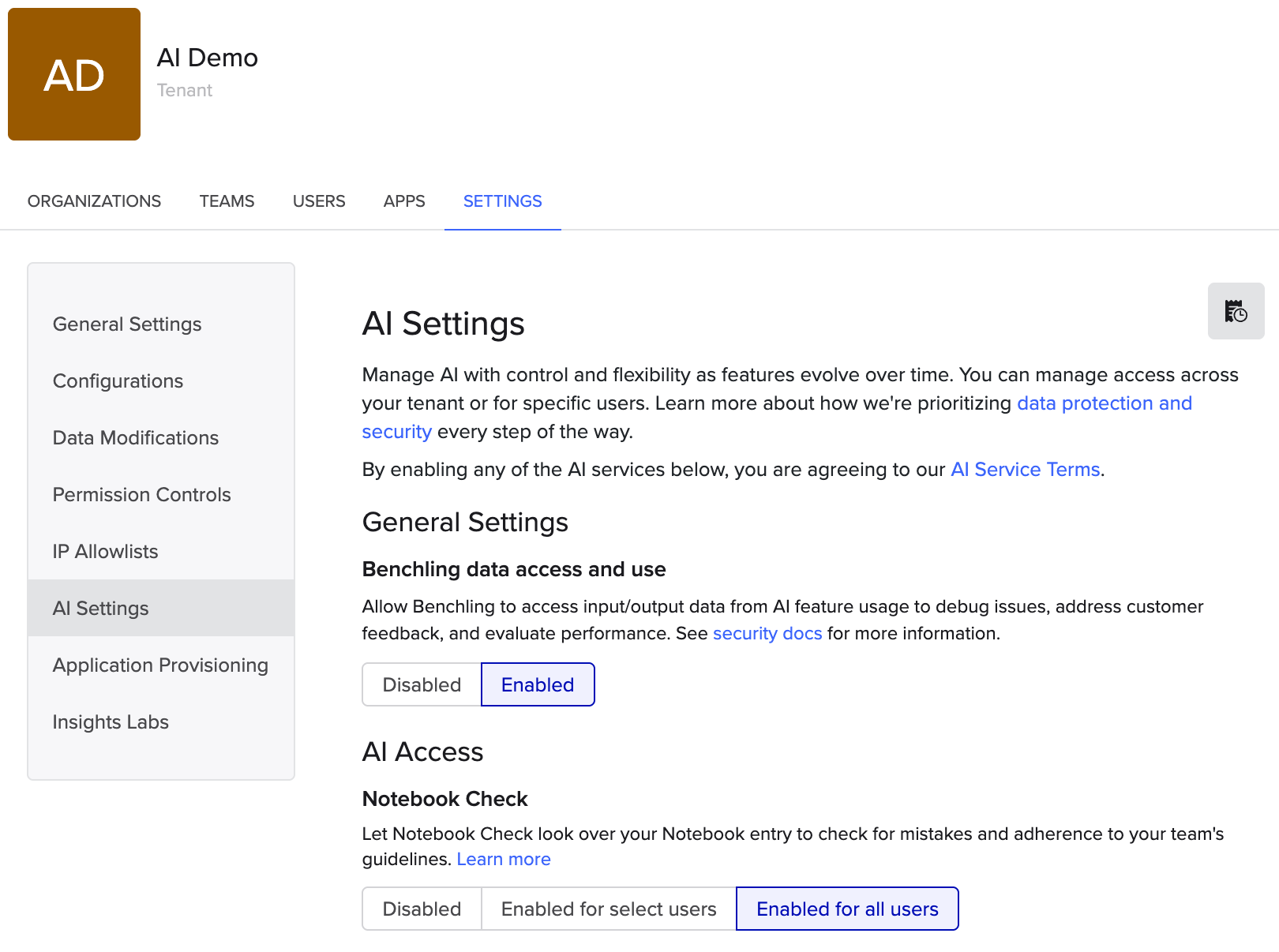 Benchling AI features must be enabled by a Tenant Admin in the Tenant Admin Console. They can be enabled and disabled at any time, and can be enabled for specific users or for all users on the tenant.