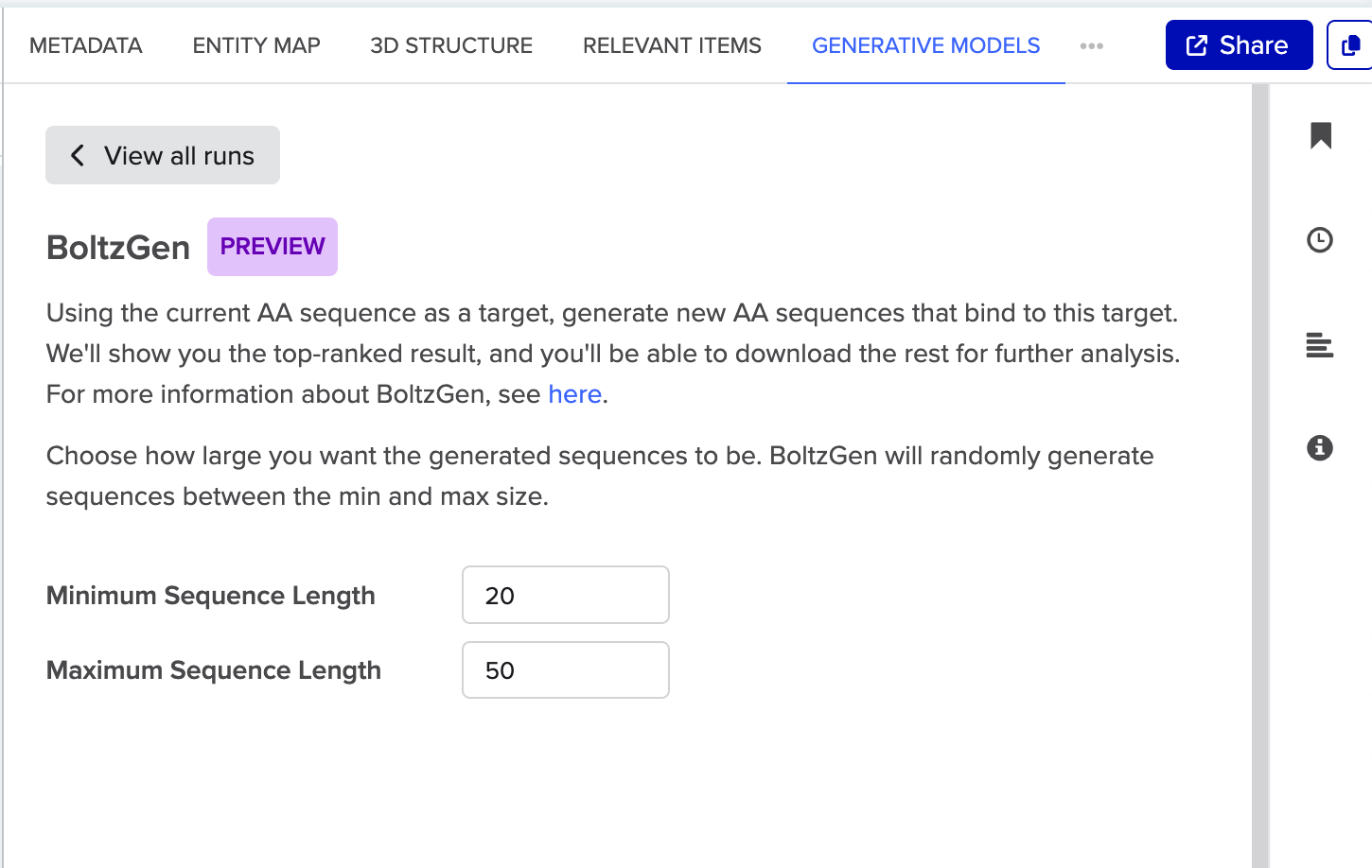 BoltzGen is a new generative model for designing protein and peptides of any modality to bind a wide range of biomolecular targets. Currently, an early preview of BoltzGen is available on AA sequences, using your AA sequence as a target. In order to have Generative Models enabled on your tenant, reach out to Benchling support at support@benchling.com.