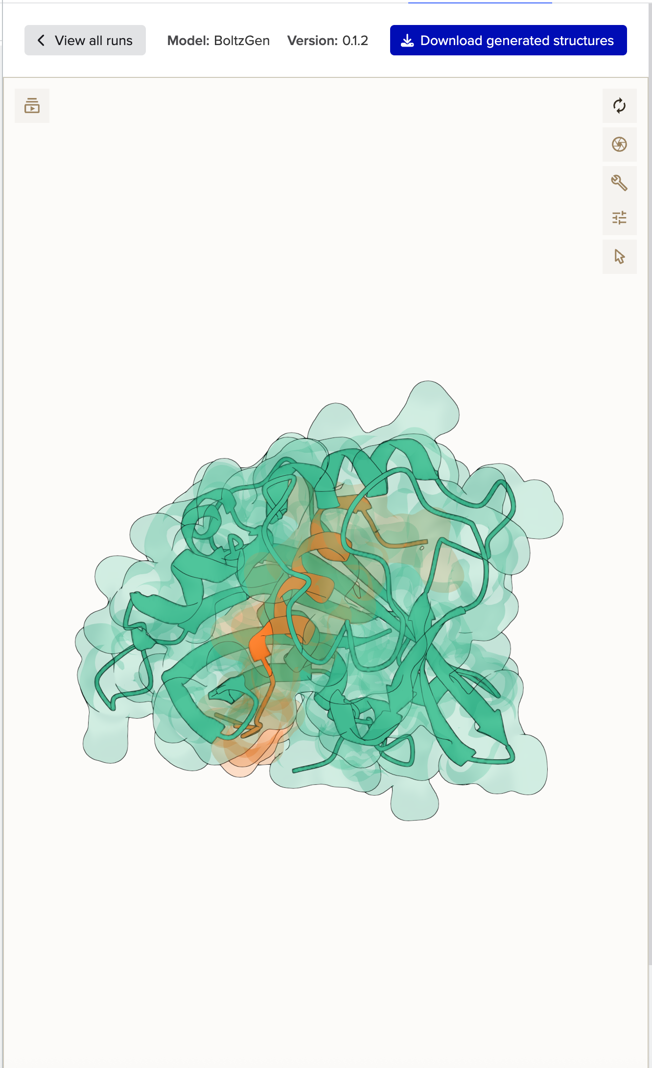 At this time, the visual output of BoltzGen is limited to the top ranked binder output. Using the Download button, additional structures will be downloaded in .cif format for visualization. These .cif files can be uploaded to an AA Sequence's Description tab or an Entry for further visualization. Additionally, the current implementation of BoltzGen is currently limited to specifying AA sequences as targets.