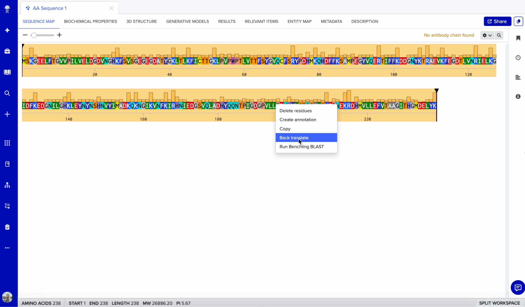 Benchling provides tools to analyze various properties of your AA sequences, aiding in characterization and research.