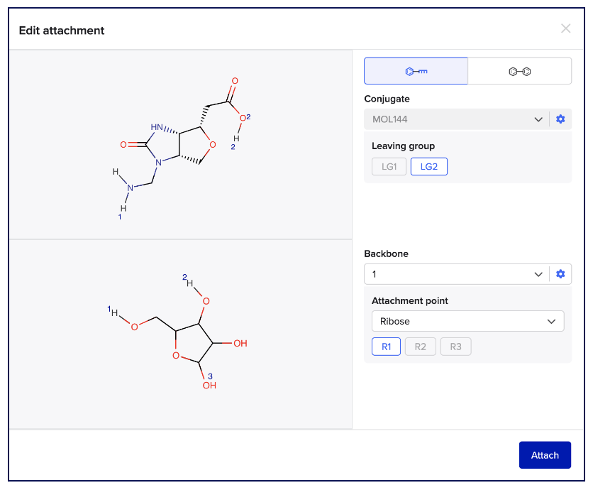 Groups of atoms in a molecule entity can be set as attachment sites, or leaving groups, to model connections between backbone and conjugate entities. Setting a leaving group will subtract those atoms from the final structure and the final molecular weight of the conjugated molecule. Leaving groups will have assigned integer values as a means to identify those leaving groups when viewing the original molecule, and during the attachment process when forming an oligo duplex or conjugate.