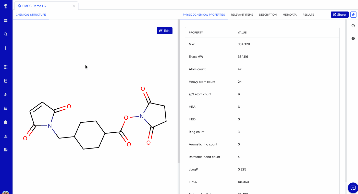 - Identify the molecule you wish to prepare to add to an oligo duplex or oligo conjugate entity and open its Chemical Structure tab