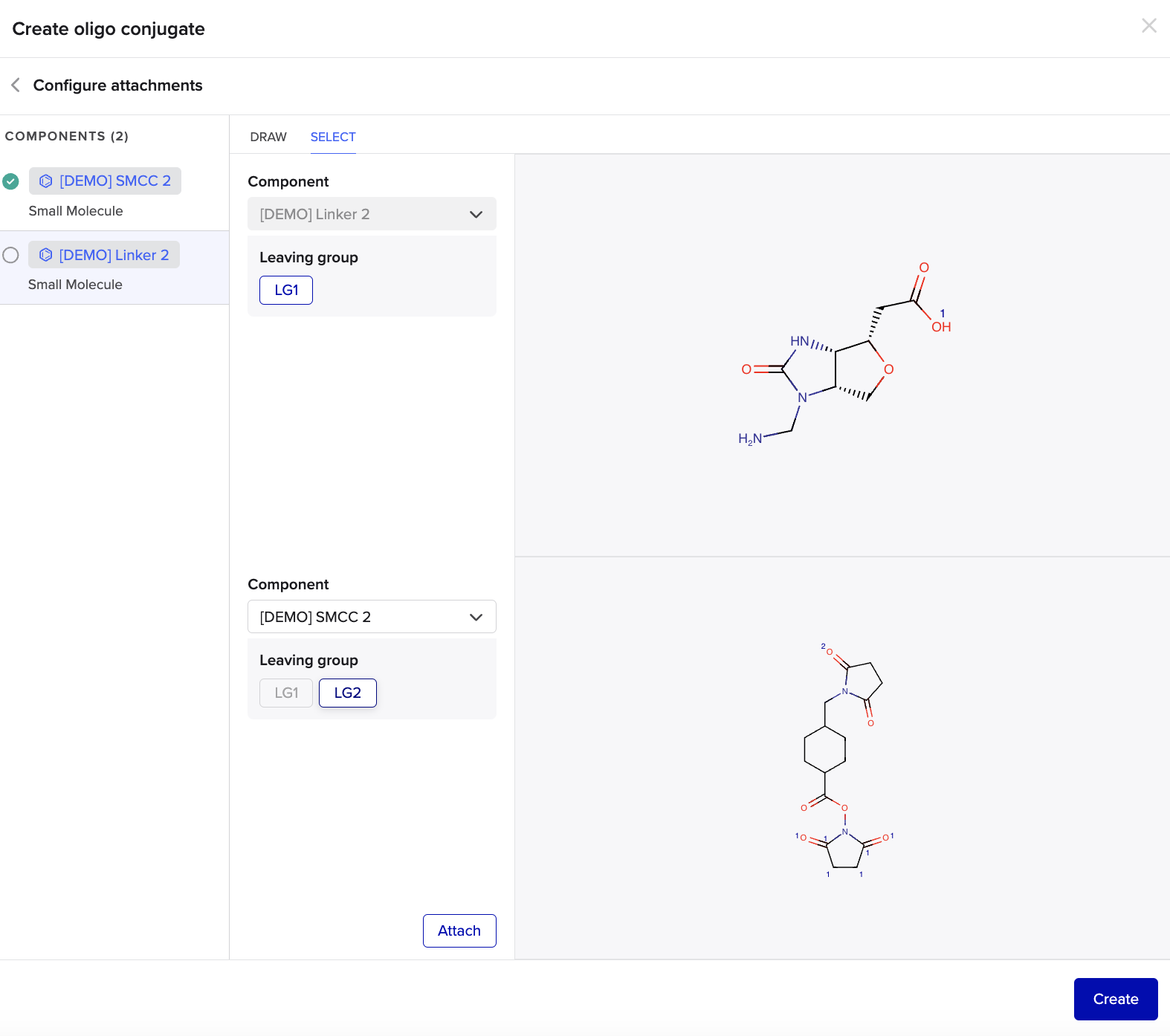 For more custom chemical attachments, or for an alternative workflow, you can use Benchling’s MarvinJS modal to draw the attachment between the oligos and components.