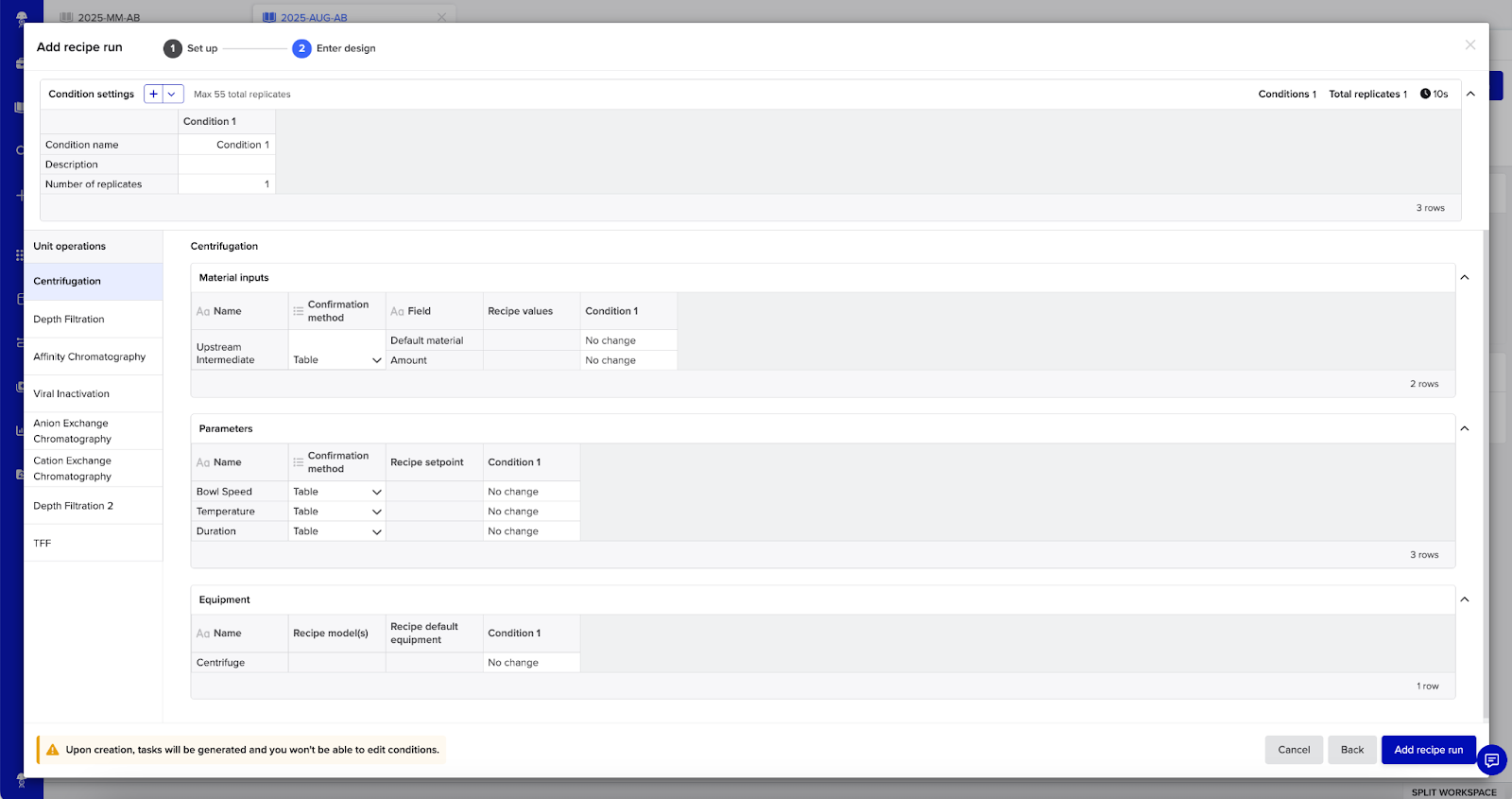 ⚠️ After this point, Conditions, Replicates, and configured setpoints cannot be changed – however new conditions can be added to an existing Recipe Run. Read how below