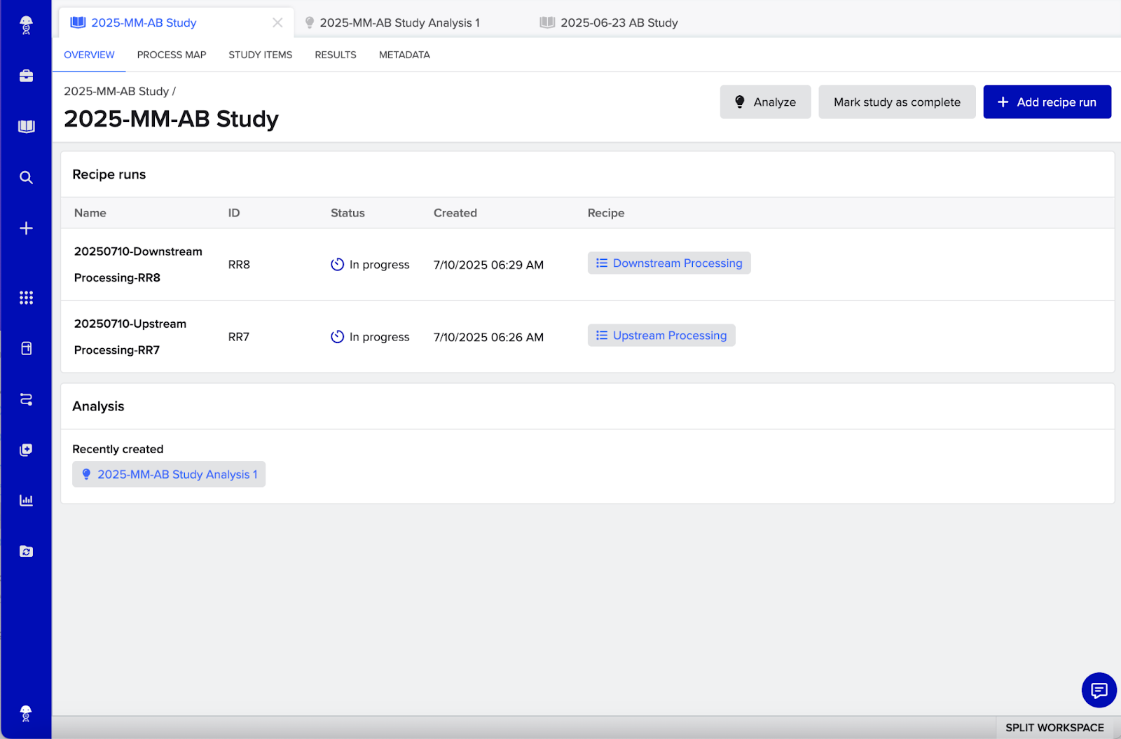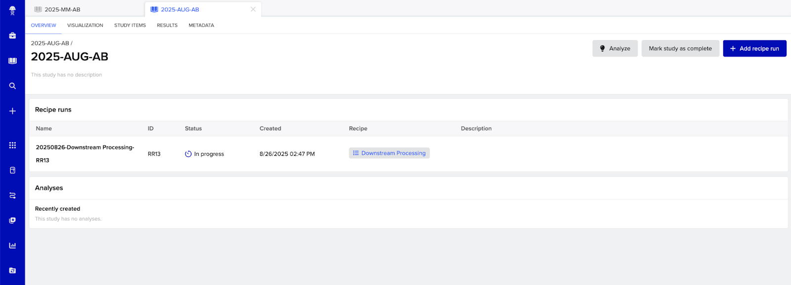 - Consolidates all existing Recipe Runs and associated Analyses in a single view.