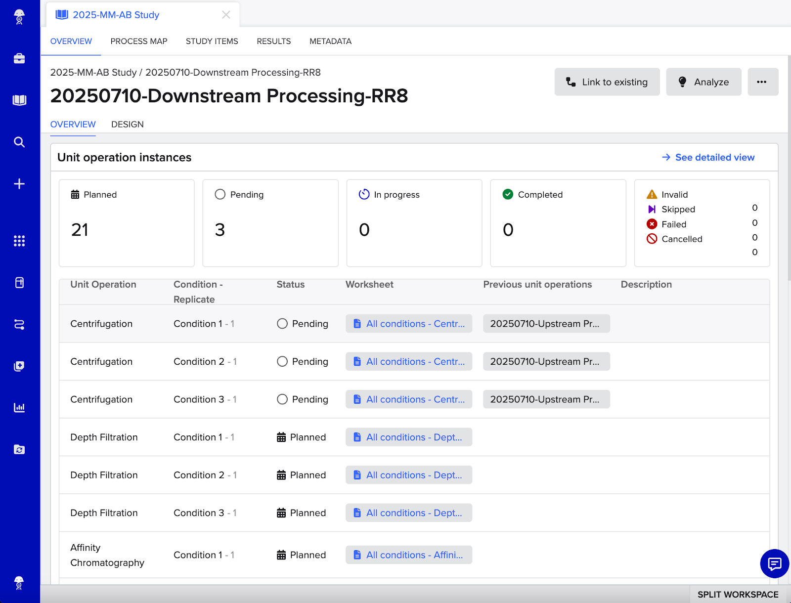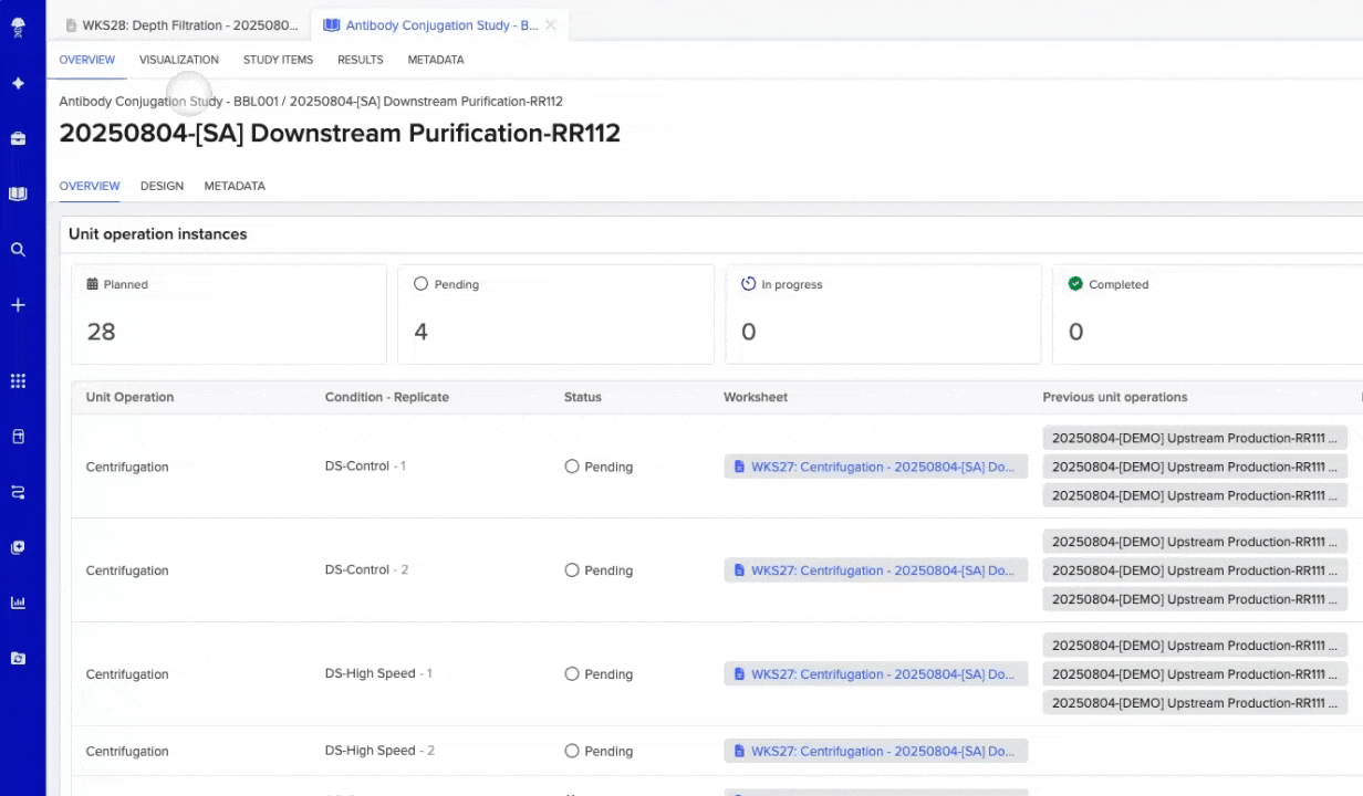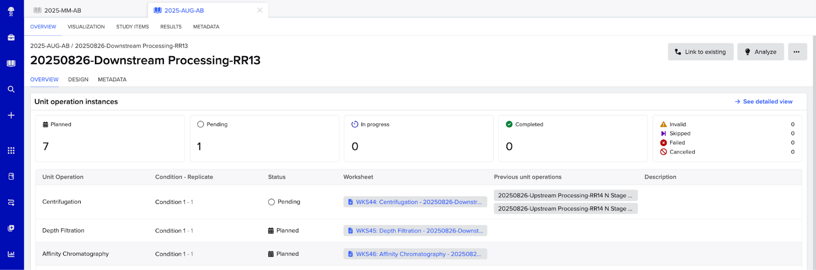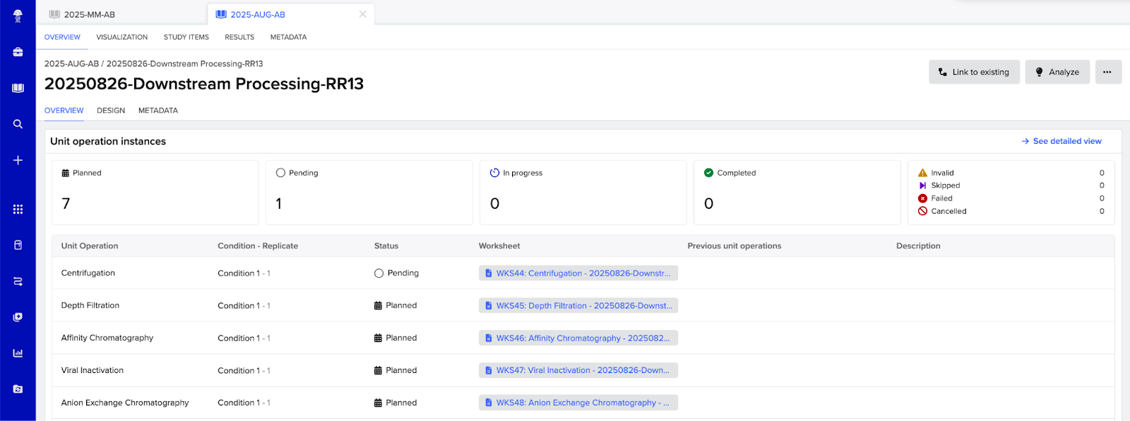 - Unit Operations Instances (Unit Operation × Condition × Replicate) are listed with status and worksheets.
