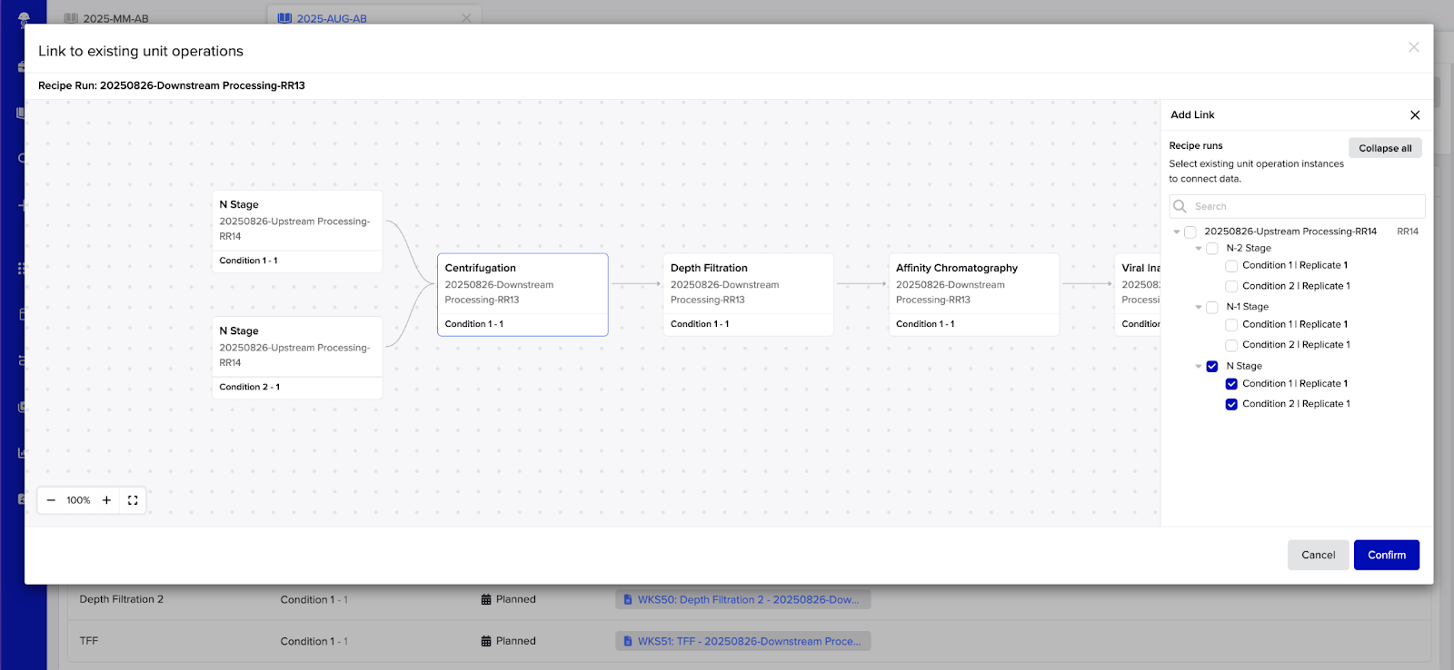 These Recipe Runs can then be linked at the Unit Operation Instance level — an output from one unit operation can be split across multiple downstream operations, or outputs from many operations can be joined into a single downstream operation.
