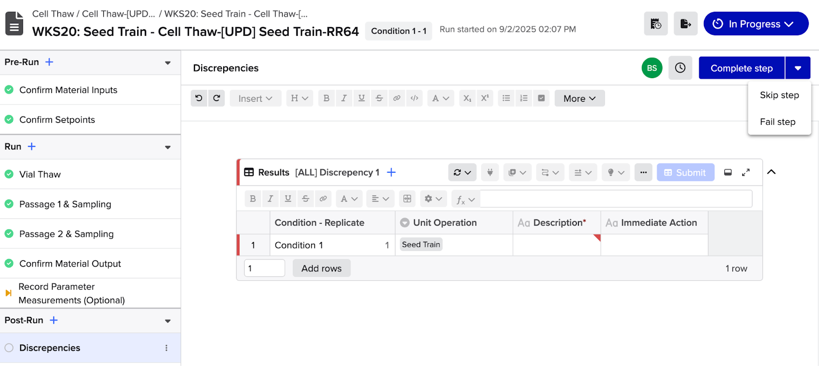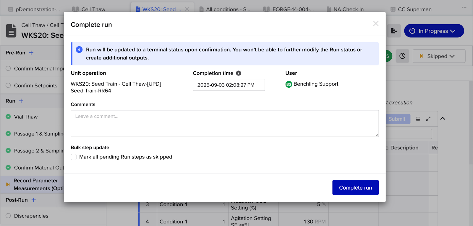 - While Post-Run Steps are optional, each should have its status updated to Completed, Failed, or Skipped. Updating the status locks the step from further edits and ensures the experiment record is finalized.