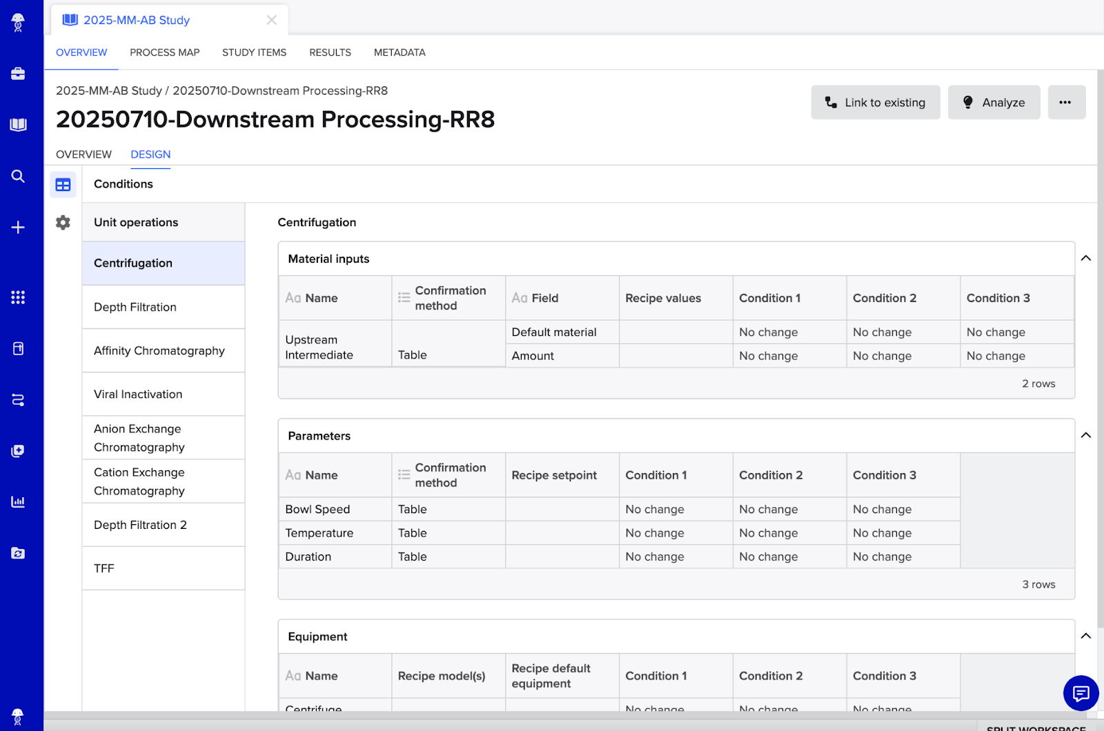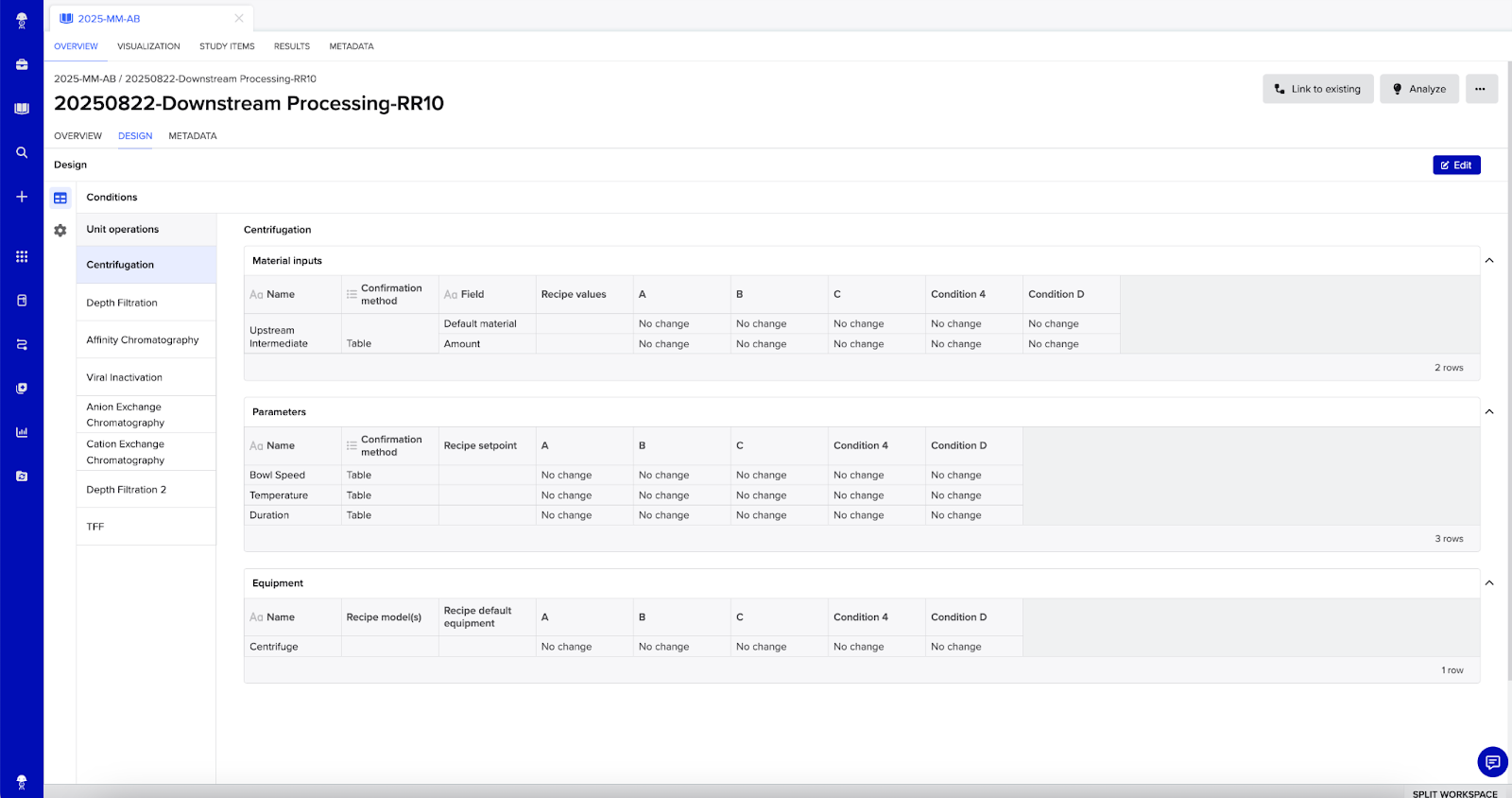 - Condition: A specific variation in process parameters across unit operations. Conditions define the variables tested in the experiment.