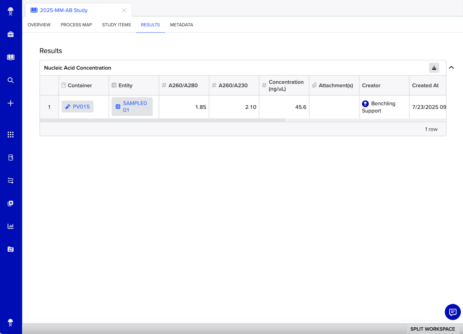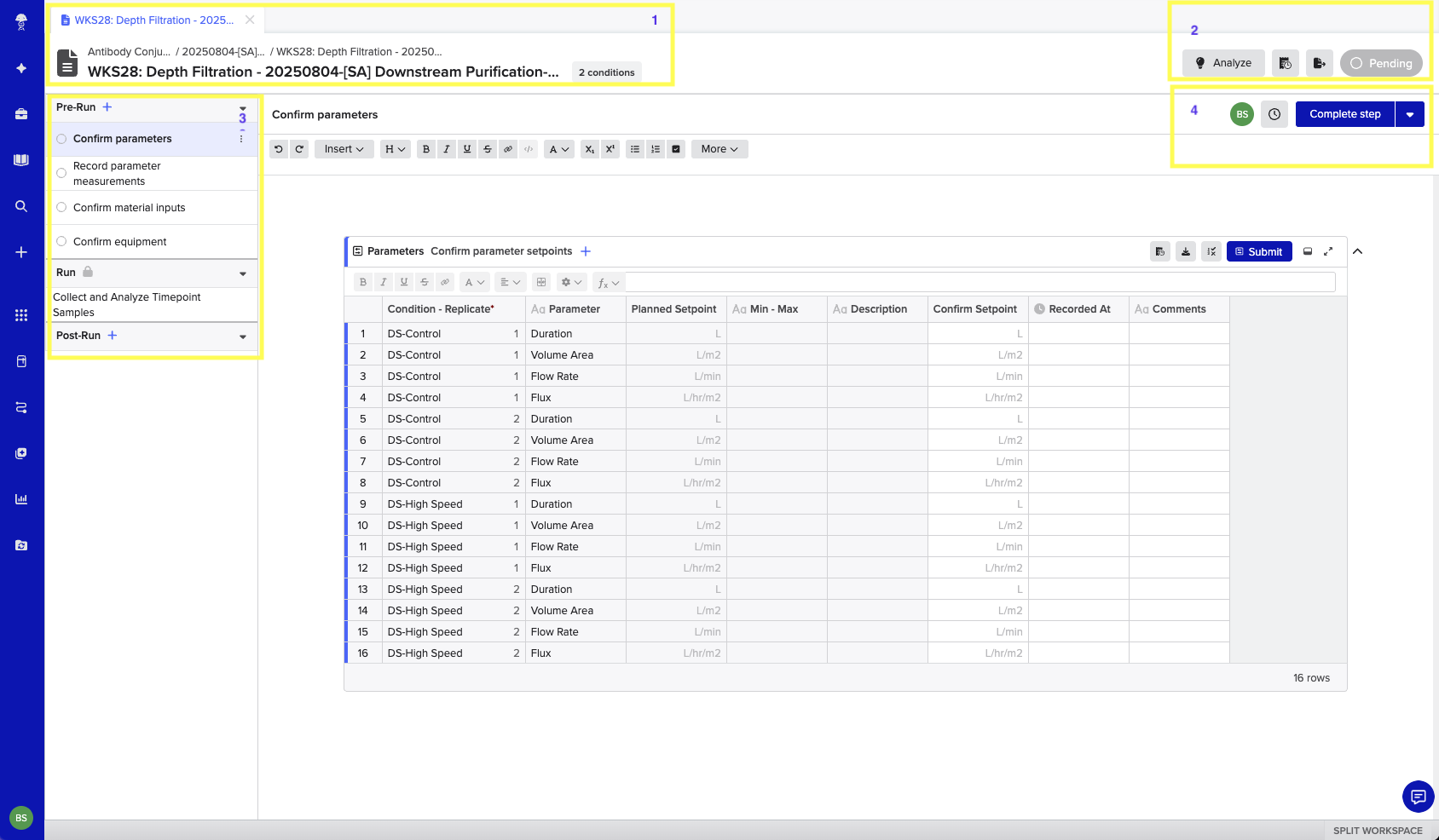 - Batch Execution – Users can execute their experiments with guided operator instructions that are dynamically populated from the Recipe and experiment plan, along with fields for structured and automated data capture.