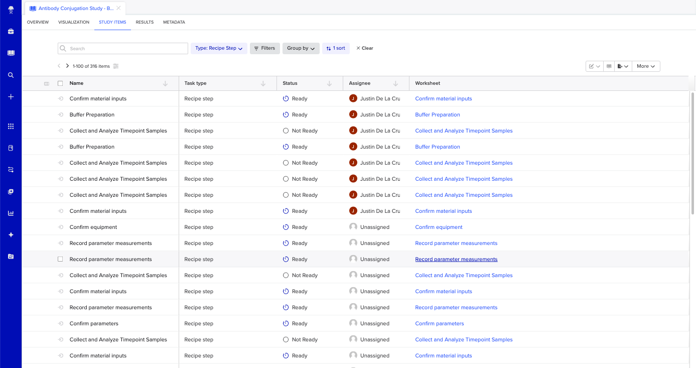 Benchling Bioprocessa cloud-native platform built to support high-throughput, structured process development. It enables PD teams to design processes, plan experiments, execute batches, and visualize data — all within a unified environment. By connecting Recipes, Studies, and Worksheets with a structured ISA-88-compatible data model, Bioprocess simplifies tech transfer, improves efficiency, and unlocks downstream data science and ML insights.