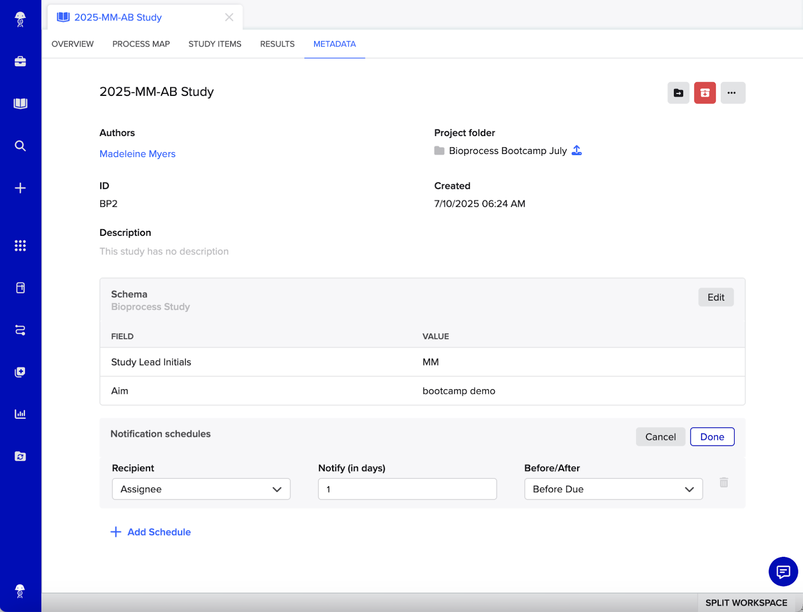 A Process Development (PD) Study is a structured container for planning and executing experiments with a Recipe. Studies define the experimental scope — including conditions and replicates — and automatically generate Worksheets for execution. Your admin must configure at least one Process Development Study schema to create a new study and add a Recipe to the Study. To learn how to configure a Study schema see our How to Configure Benchling Bioprocess article.