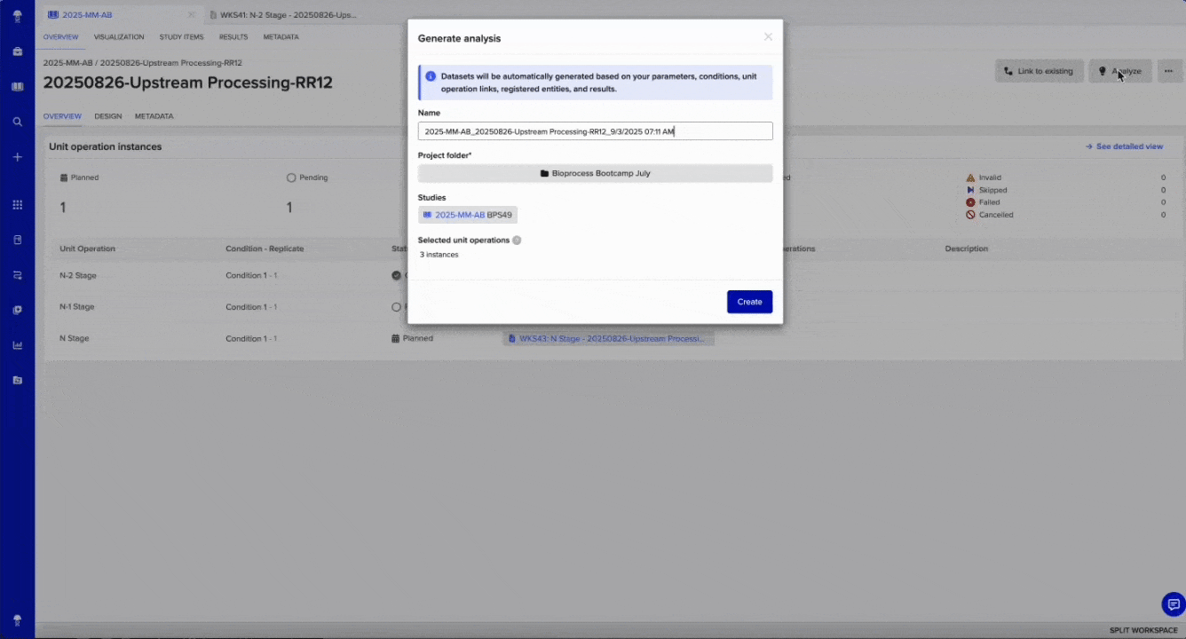 - Analysis tool can be opened from a Study, Recipe Run, or Worksheet overview using the Analysis💡 icon in the top-right corner of the page.