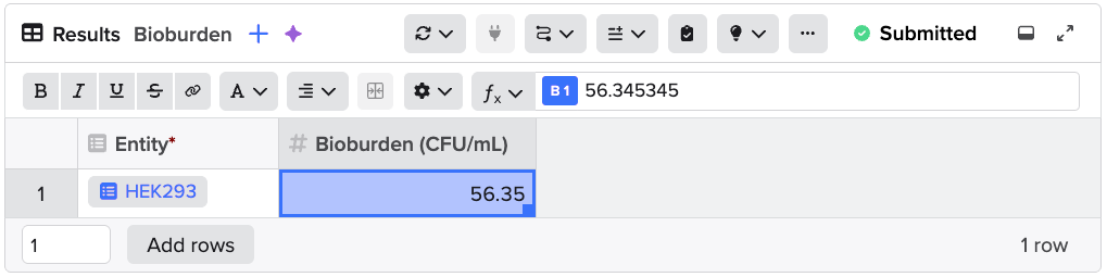 Users may define display precision for decimal fields in registration and result schemas. These settings control how values are displayed throughout Benchling including in Registry and Search. In Notebook tables, display precision controls how values appear after they are submitted. The original value entered into tables is retained and used in formula evaluation. Formula evaluation does not use the precision display value for calculations.