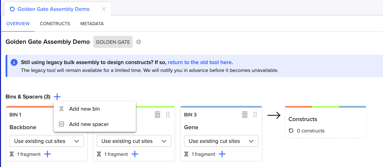 In each assembly type, bins are used to represent a fragment or group of fragments being used to assemble the final construct(s). Bins will automatically be set up based on the “Number of fragment bins” field in the assembly set-up modal. When performing cloning, spacers can be added next to bins where primers are used to amplify a fragment; when concatenating sequences, "constants" can be added next to bins to include short sequence motifs in every construct you create.