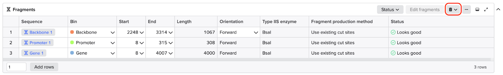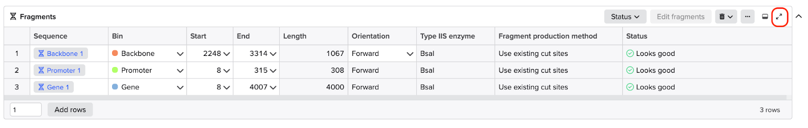 - Click save to add the sequence(s) to the fragments table with the appropriate bin set
