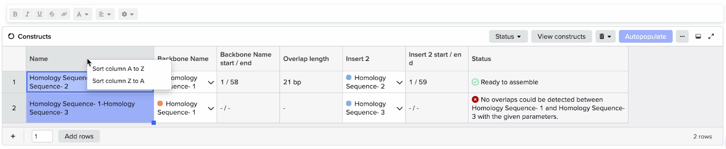 Once you have configured your fragments and associated settings, you can build out your construct in the construct table. To populate all possible constructs using your fragments, click Autopopulate in the upper right of the constructs table. You can also manually fill out the table to assemble your desired constructs in cases where you do not want every possible combination of fragments.