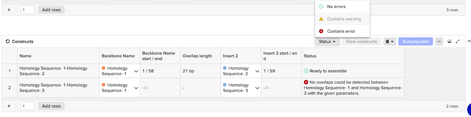 - If the status is Contains warning or Contains error, an error message will appear within that cell. Prior to viewing and assembling your constructs, errors will need to be resolved. Warnings can be either resolved or ignored.