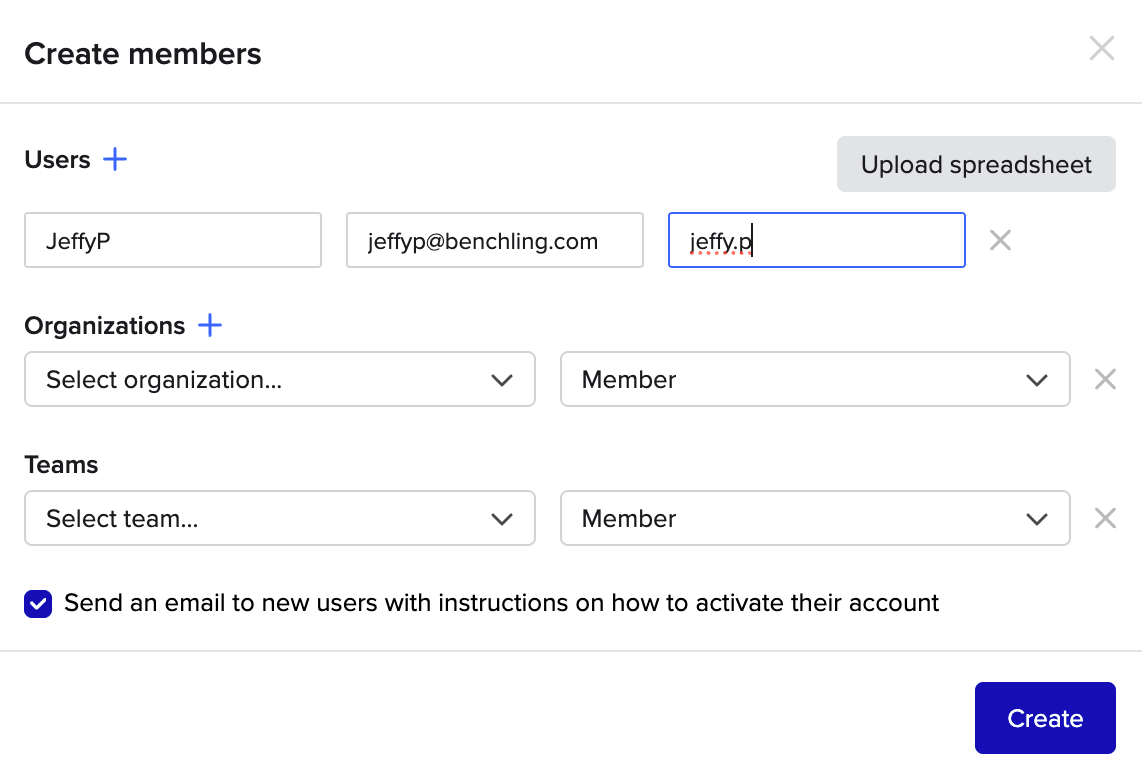 To bulk create users, click Upload spreadsheet where you can copy over user information in CSV format to go through the creation flow.