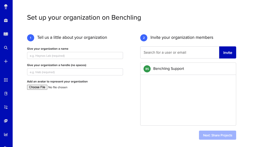 Tenant Admins can create new organizations in Benchling when onboarding a new group or setting up a new business unit. Through this process, you can share specific projects and assign initial members or teams: