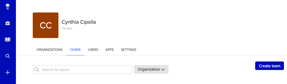 If you have Organization Administrator permissions, navigate to the Teams tab of your Organization and click Create team to create a team.