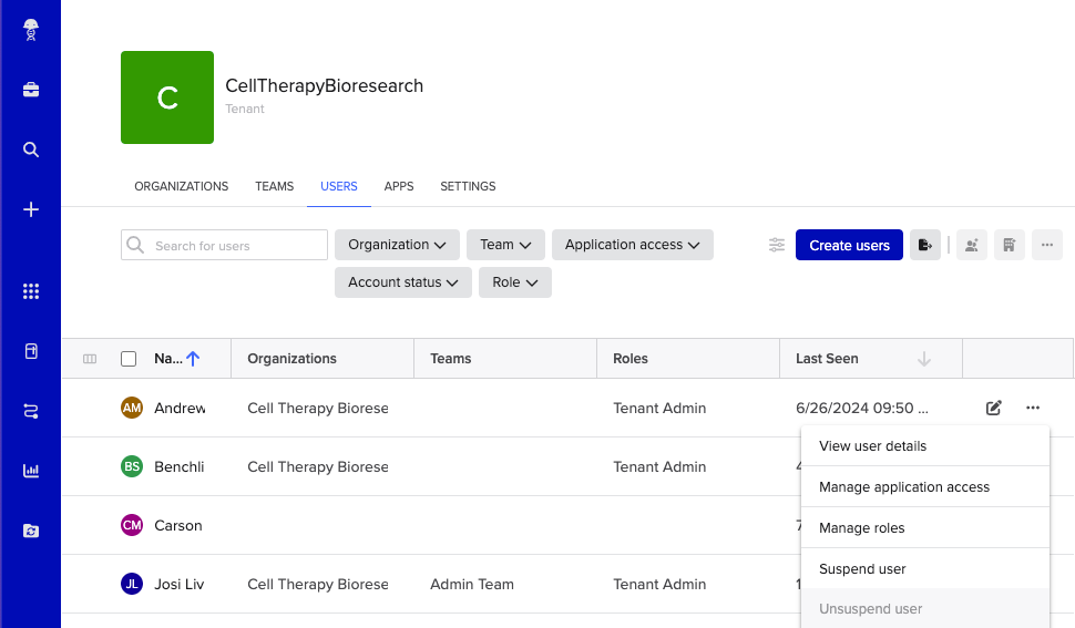 1. Go to the Users tab of the tenant admin console