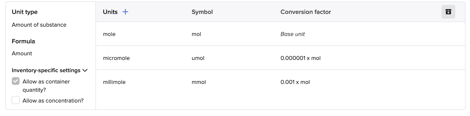 7. For each Unit type, expand the Inventory-specific settings to select whether the units in each unit type should be included as options in the container quantity and/or concentration fields on inventory schemas
