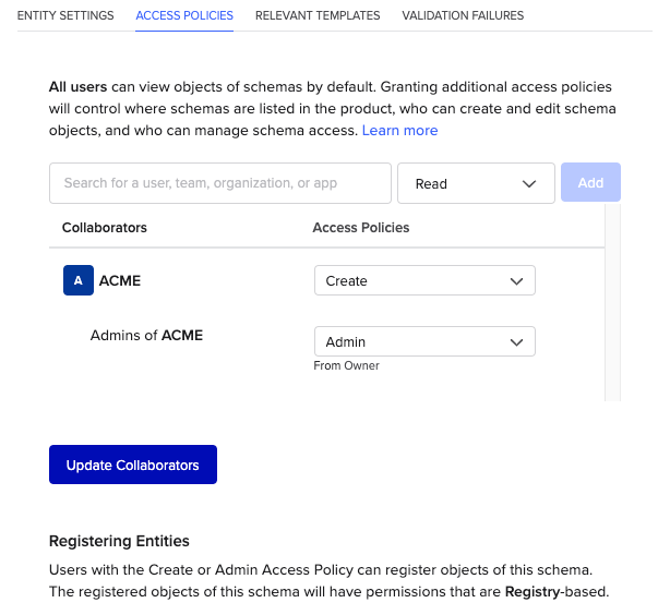 A: No. It is not possible to set access policies for Inventory or Workflow schemas. It is possible to grant permissions to update workflow schemas at the Team level using the Schema Permissions checkbox on the Team’s Settings page.