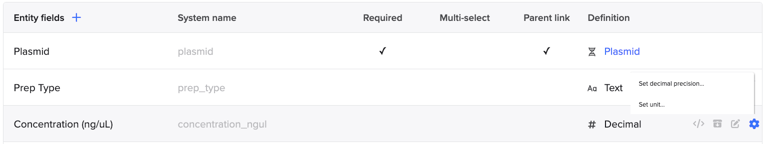 Each unit in Benchling is organized under a unit type (e.g., Volume, Mass, Time). Unit types act as categories for related units and must be defined before you can assign any units to a field. Once a unit type is created, you can specify the accepted units within it (e.g., liters and milliliters for Volume). These units are then referenced when configuring fields in a schema.
