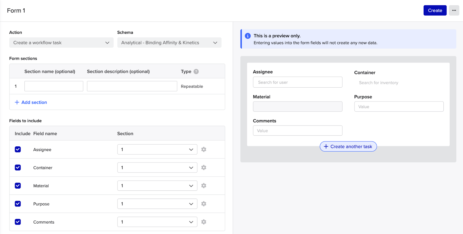 - Preview the Form to the right, at any time click Create another task in the preview window to see what your team will see when they use the form