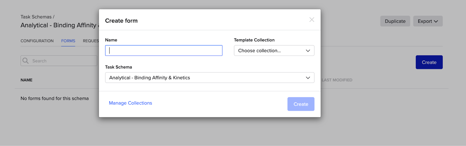 - Fill out the Form attributes by giving the Form a descriptive name and using the dropdown to confirm what Template Collection and Task schema the Form belongs to