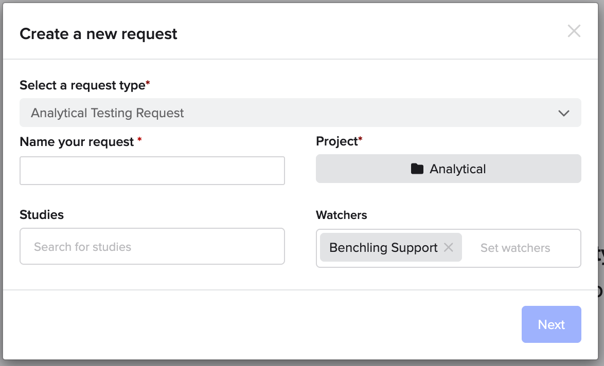 - Watchers: Optional - this defaults to the request creator, but additional users can be added to get notified of request completion progress