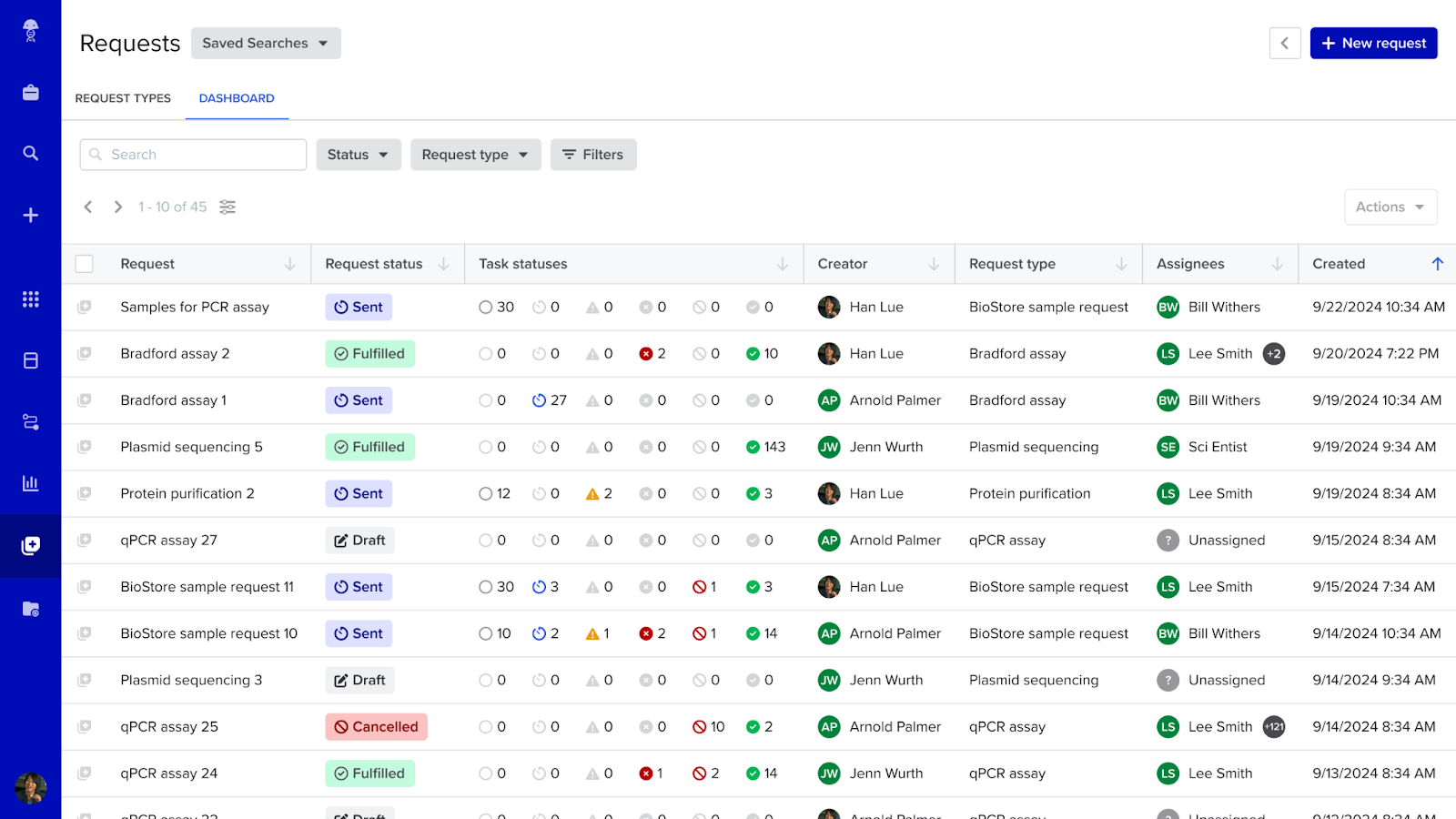 Benchling’s request management features in Workflows—including Requests and Forms—make it easier to initiate and track work. These tools allow for better control of the work your team does and are built on top of a Workflow task to provide them a more customized experience.